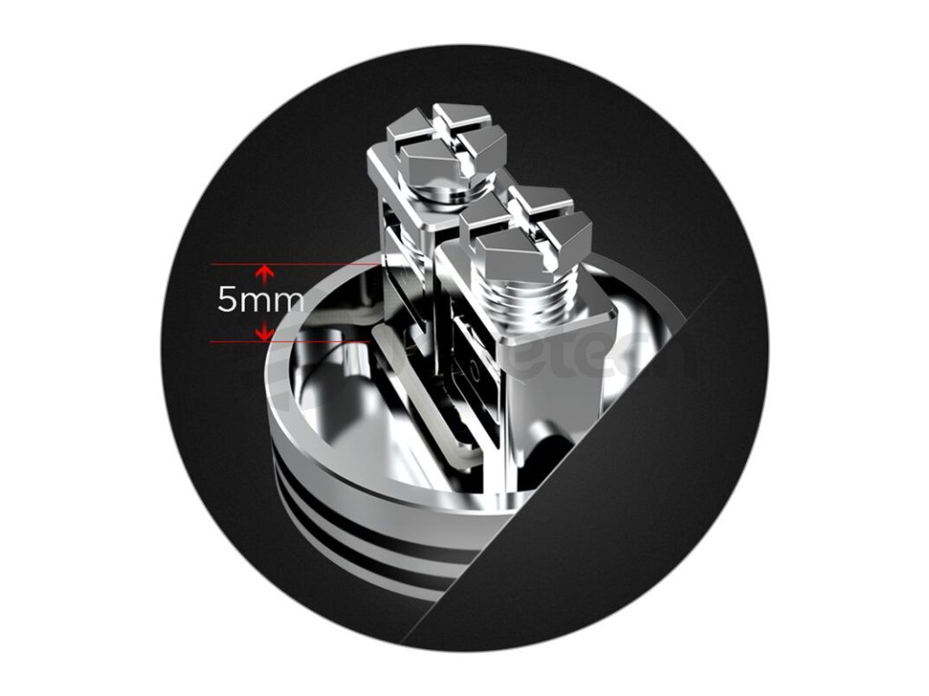 Uvnitř atomizéru se nachází precizně navržená základna. Tuto základnu tvoří dva sloupky, do nichž je možné nainstalovat jednu, nebo dvě spirálky dle vlastního výběru. Pokud preferujete větší produkci páry a výraznější chuť, osaďte ji dvěma spirálkami, jestliže máte raději příjemnější potah s menším množstvím páry, zvolte jednu spirálku. Otvory pro uchycení spirálek jsou dostatečně široké a umožňují použití i průměrově silnějších a složitějších drátů. Spirálky ukotvíte pomocí dvou šroubků umístěných ve vrchní části základny. Speciální clamp mechanismus umožňuje ideální dotažení nainstalovaných spirálek a snadnou instalaci i začátečníkům v oblasti DIY vapingu. Pro samotnou vatu zůstává také dostatek místa, pod základnou se nachází bazének s délkou 5 mm, do kterého lze velice pohodlně umístit přírodní vatu a stále vám zbyde dostatek prostoru například při squonkování.