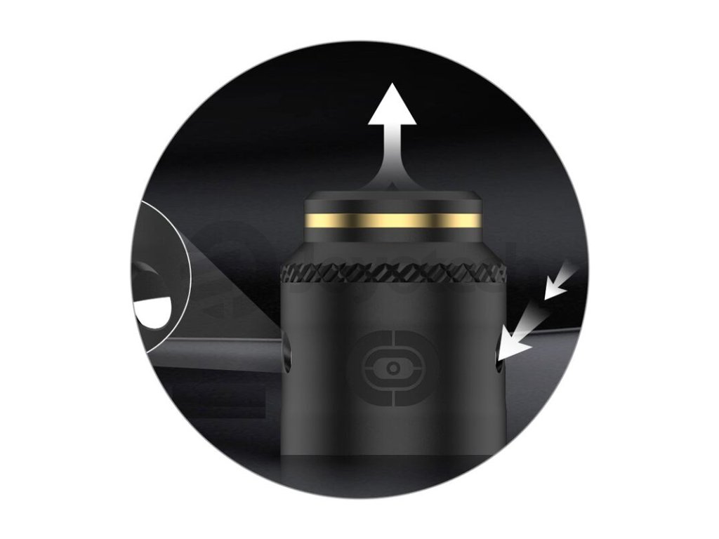 V boční části těla atomizéru se nachází airflow systém s prakticky řešenými otvory pro přísun vzduchu. Ty jsou mírně zkosené a nabízí tak efektivnější přísun vzduchu do atomizéru, díky čemuž je získána plnější a lepší chuť výsledné páry. Otvory jsou navíc regulovatelné, po obou stranách se nachází tři menší otvory, nicméně můžete si ponechat otevřenou například i jen jednu stranu. Volba je čistě na vás.
