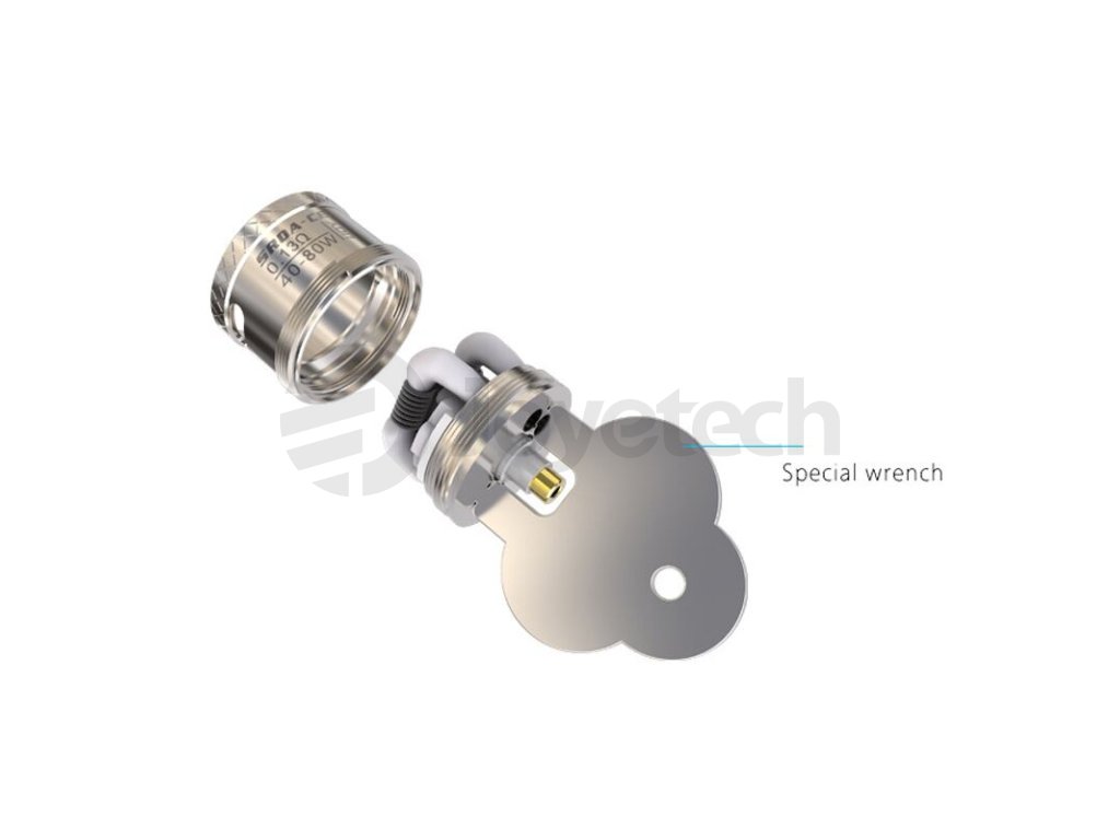 V těle atomizéru tedy nenajdete klasickou základnu pro montáž spirálek, nýbrž již předmotané žhavící tělísko. V základním balení se nachází tělísko SRDA-CE s odporem 0,13 ohm. Jak je již z celkového odporu patrné, jedná se o tělísko vhodné k přímému potahování do plic. Jeho hlavní výhodou je dlouhá životnost díky možnosti výměny vaty uvnitř tělíska. Pokud dojde k připálení vaty, jednoduše použitou vatu odstraňte a do spirálky vložte čistou a nepoužívanou vatu. Tělísko poté můžete znovu používat.