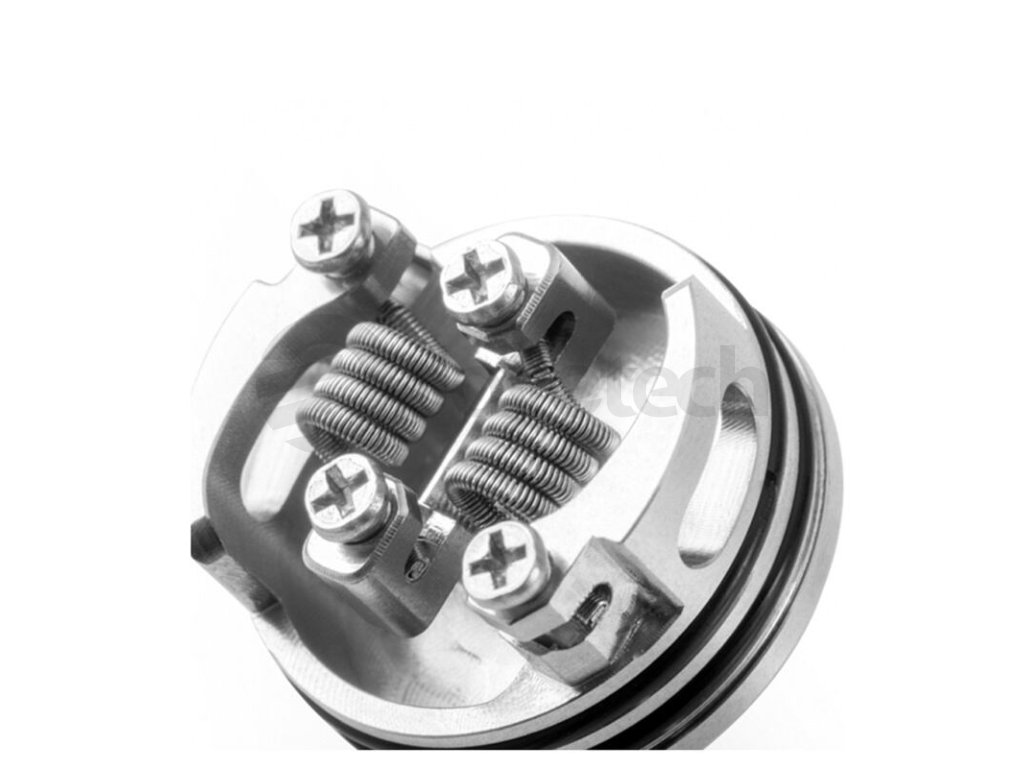 Celý atomizér je vyroben z hliníku a vrchní, široký náustek je vyroben z resinu. Dohromady tvoří komplexní celek a představují úchvatný design a stylové zpracování. Uvnitř atomizéru se nachází nová základna pro instalaci celkem dvou spirálek. Kontakty jsou dostatečně široké i pro silnější dráty typu clapton. Jistě oceníte jednoduchou instalaci, kterou hravě zvládnou i začátečníci. Základna navíc disponuje dostatkem prostoru pro usazení vaty.
