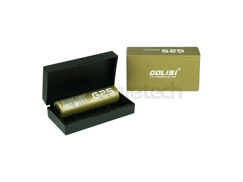 Golisi G25 je dobíjecí baterie 18650, která je úsporná a navržená pro spolehlivé a dlouhodobé používání. S kapacitou 2500 mAh vydrží dlouho a poskytuje konstantní výstup až 20 A , i když kapacita klesne pod 40 %. Při krátkodobém vyšším zatížení absorbuje špičkové proudy až 30 A, přičemž pro větší bezpečnost je vybavena vyrovnávací pamětí. Díky až 800 nabíjecím cyklům má dlouhou životnost, a je tak šetrná k životnímu prostředí. Díky mnoha bezpečnostním prvkům je tak jeho používání bezpečné a účinné. Všechny baterie Golisi se vyznačují jedinečnými vlastnostmi, které podporují bezpečné používání. Typ baterie IMR 18650, konstantní vybíjecí proud 20 A, jmenovité napětí 3,7 V, ybíjecí napětí 2,75 V, nabíjecí napětí: 4,20 ± 0,05 V, životnost: >800 nabíjecích cyklů. Bezpečnostní certifikáty CE, ROHS, FCC, MSDS, WEEE, UN38.3, IEC62133, pádový test.