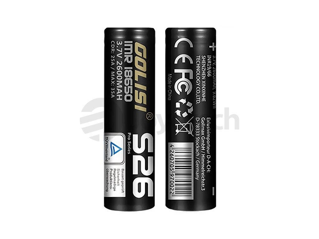 Golisi 18650 S26 je vysoce výkonný lithium-iontový článek typu 18650. Kombinuje vysoký konstantní vybíjecí proud až 25 A s kapacitou 2600 mAh. Díky až 800 nabíjecím cyklům má dlouhou životnost, a je tak šetrná k životnímu prostředí. Díky mnoha bezpečnostním prvkům je tak jeho používání bezpečné a účinné. Pevné a robustní smršťovací fólie, které naleznete na všech dobíjecích bateriích GOLISI® rovněž zajišťují dlouhodobou bezpečnost. Baterie se dodávají v boxu na baterie pro jejich pohodlné a bezpečné přenášení. Typ baterie IMR 18650, kapacita 2600 mAh, konstantní vybíjecí proud 25 A, jmenovité napětí 3,7 V, nabíjecí napětí 4,20 ± 0,05 V, životnost: >800 nabíjecích cyklů. Bezpečnost CE, ROHS, FCC, MSDS, WEEE, UN38.3, IEC62133, pádový test.