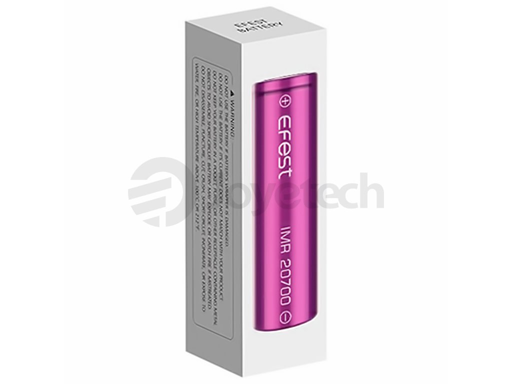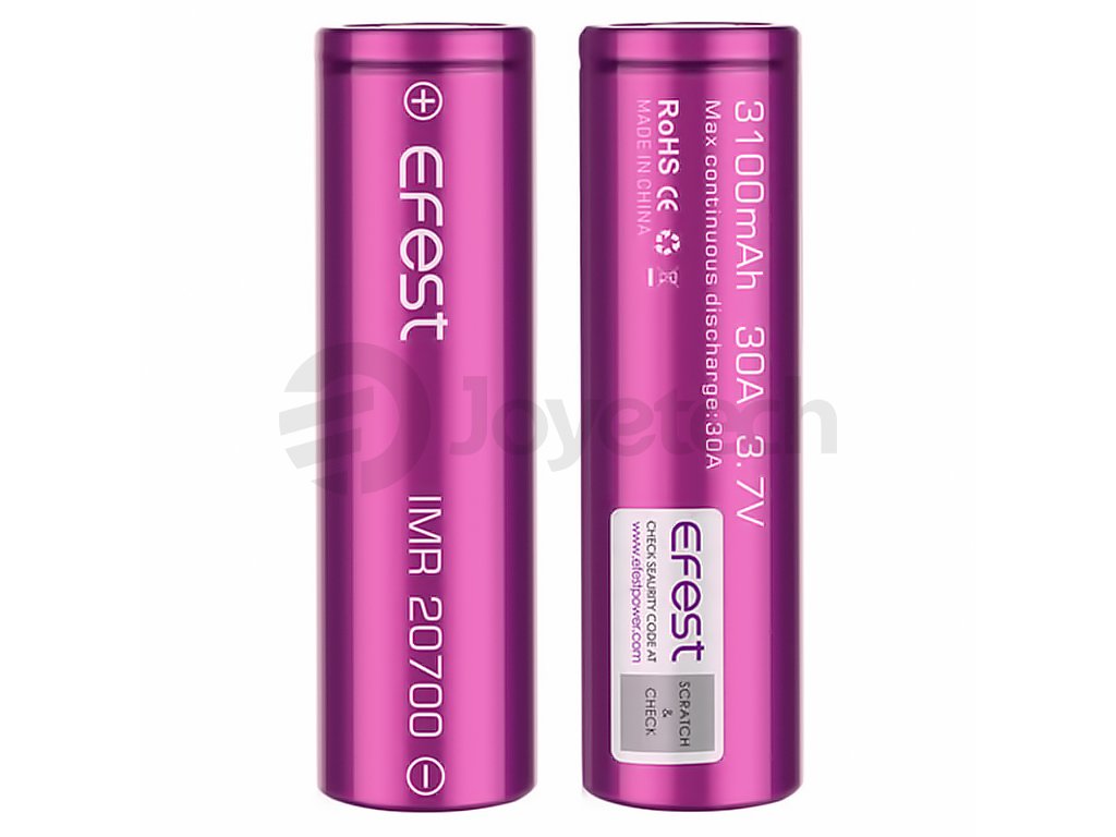 Efest IMR 20700 3100mAh 30A je výkonná batarie typu 20700, která je vhodná pro drtivou většinu výkonných a nízkoodporových cigaret, modů a gripů, podporujících uvedený typ baterie, které vyžadují pro svůj provoz vysoký vybíjecí proud. Zpravidla se jedná o e-cigarety a gripy, které jsou primárně určené pro přímý styl vapování (DL). Baterii lze samozřejmě použít i pro méně výkonné zařízení, které tento výstupní proud nepožadují.