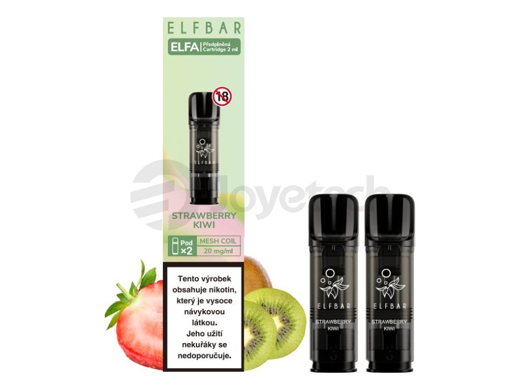 Výrazné tóny kiwi se sladkou a šťavnatou jahodou... Předplněné cartridge Elf Bar ELFA obsahují 2ml liquidu o síle nikotinu 20mg. Cartridge obsahují prvotřídní liquid s nikotinovou solí, díky které dochází k rychlejší a kvalitnější vstřebatelnosti = bez dráždivého pocitu v krku oproti klasickým liquidům. Nedílnou součástí cartridge je spirálka Mesh pro rychlejší žhavení, rovnoměrné odpařování, vynikající chuť liquidu a větší tvorbu páry. Poměr 50VG/50PG