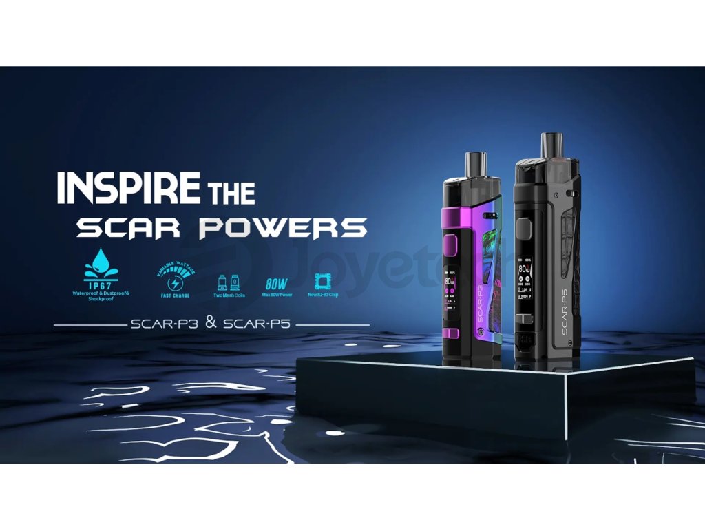 Pod Cartridge sloužící jako zásobník pro Vaší oblíbenou náplň (e-liquid), která v tomto případě slouží zároveň i jako náustek a nosič samotné žhavící hlavy. V případě elektronické cigarety Smok Scar-P5 a P3 se jedná hned o dvě takové Cartridge, o celkovém objemu 5ml, kdy každá je určena pro jiný styl vapování a jinou žhavící hlavu. V jednom případě se jedná o žhavící hlavu s označením RPM Mesh s odporem 0,4Ω, která je vhodná pro MTL styl vapování (jako u klasické cigarety), při doporučeném výkonu 25W, a u druhé se jedná o žhavící hlavu s označením RPM 2, rovněž s mesh spirálkou a celkovým odporem 0,16Ω, která se díky svému nízkému odporu velmi hodí pro DL styl potahování (přímým potahováním do plic). Doporučený výkon pro tuto žhavící hlavu je mezi 25-50W, avšak nejlepšího podání chuti dosahnete při výkonu 40W. Instalace cartridge a žhavící hlavy probíhá pouhým zasunutím, a je tak velmi jednoduchá a zvládne jí bez problémů každý.