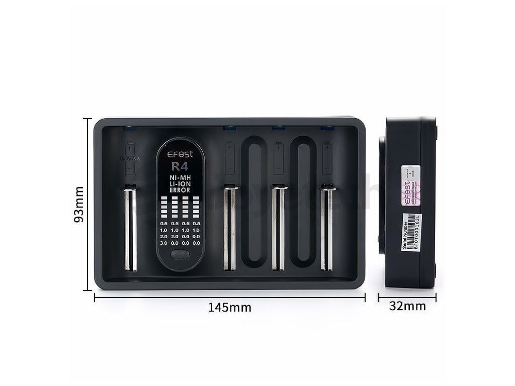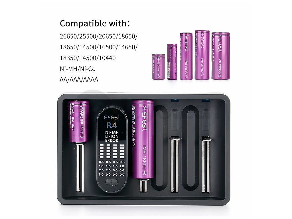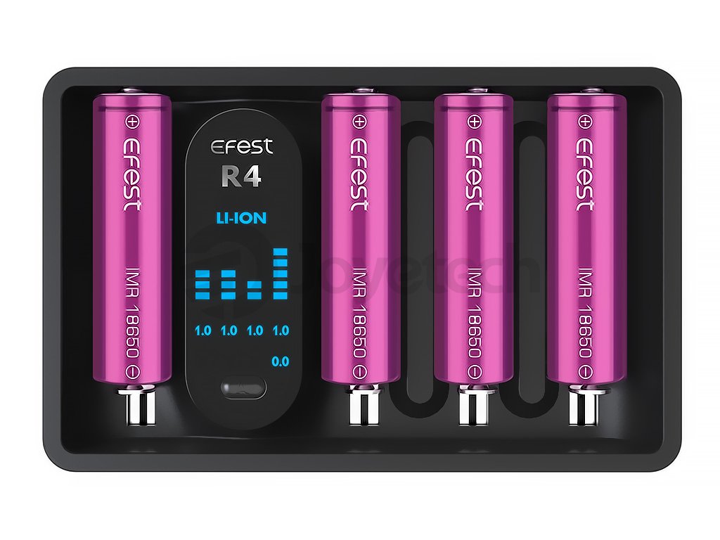Inteligentní rychlá QC nabíječka Efest iMATE R4 je cenově dostupná a přesná nabíječka baterií, která dokáže bezpečně nabíjet až čtyři baterie současně, je vyrobena z odolných a nehořlavých PC materiálů a je navržena tak, aby baterie v přihrádkách nabíjela konzistentním tempem. Automaticky detekuje typ baterie, reguluje a řídí množství a rychlost, jakou se baterie může nabíjet, a díky funkci automatického vypnutí zabraňuje přebíjení, čímž dále udržuje životnost bateriových článků. Inteligentní detekce typu baterie a její velikosti, zobrazení odhadované doby nabíjení. Podporuje baterie typu 10440, 14500, 14650, 16340, 16650, 17650, 17670, 18350, 18490, 18500, 18650, 20700, 22650, 26500, 26650, AAAA, AAA, AA aj. DC Input 12V / 1.5A 9V / 2A 5V / 2A.