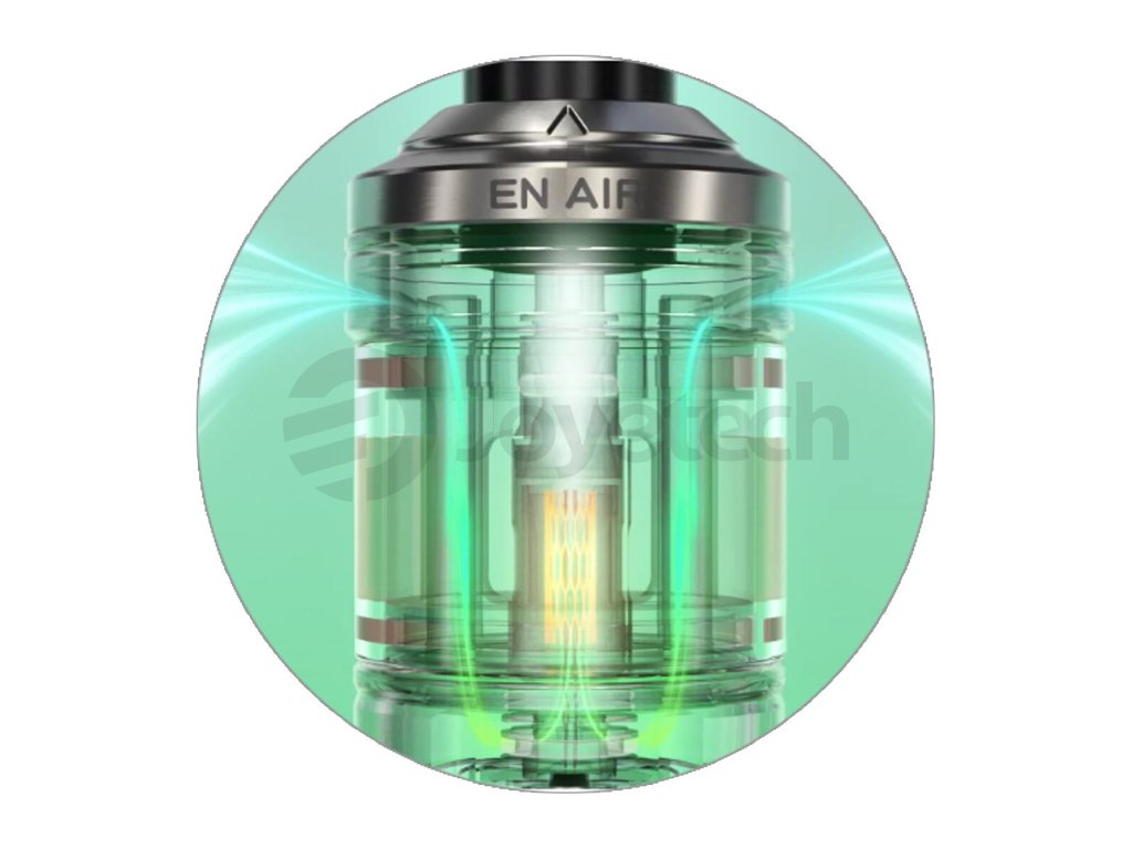 Atomizér Eleaf EN Air Tank se pochlubí stylovým minimalistickým designem a uživatelsky přívětivou obsluhou díky praktickému hornímu airflow systému a hornímu plnění, čímž zabraňuje možným únikům e-liquidu pro čistý požitek z vapování. Atomizér je kompatibilní s platformou hlav EN Coil, díky čemuž budete mít k dispozici variabilitu při výběru vhodného odporu. Precizně navržený airflow systém s regulací vylepší váš požitek z každého potahu a umožní snadnou volbu mezi utaženějším a volnějším vapováním. Zažijte pohodlí s atomizérem Eleaf EN Air.