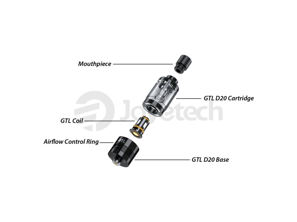 Ve spodní části clearomizéru se nachází praktický systém regulace airflow, otáčením regulačního kroužku si snadno a rychle nastavíte potřebnou tuhost potahu. V základní verzi se jedná o MTL clearomizér. Je totiž kompatibilní se žhavícími tělísky Eleaf GTL, přičemž v balení na vás čekají hned dvě tělíska z této série v černém provedení. Jedná se o tělíska s odpory 0,8 ohm a 1,2 ohm. Samostatně si pak můžete k modelu zakoupit také tělísko s odporem 0,4 ohm pro rozšíření funkčnosti na utaženější RDL vaping. Eleaf GTL D20 Tank se skvěle hodí zejména pro začátečníky a uživatele, kteří si chtějí vyzkoušet krásy MTL vapingu a poohlíží se po základním a jednoduchém clearomizéru.