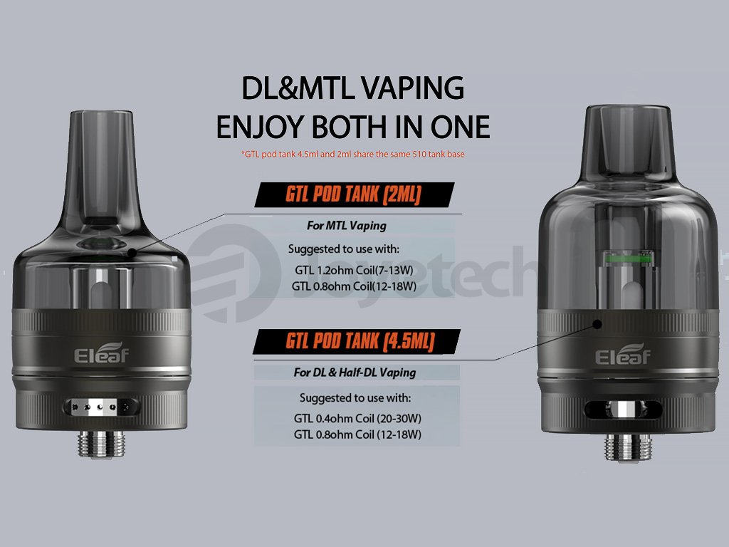 Inovativní Pod Tank Clearomizér společnosti iSmoka-Eleaf nesoucí označení GTL. Objem 4,5ml, širší náustek vhodný pro DL styl vapování. Podpora žhavících hlav Eleaf GTL, možnost regulace přívodu vzduchu, závit 510, jednoduše vyměnitelná magnetická Cartridge se spodním plněním. Rozměry 51mm x 26mm, 2x žhavící hlava GTL v Setu.
