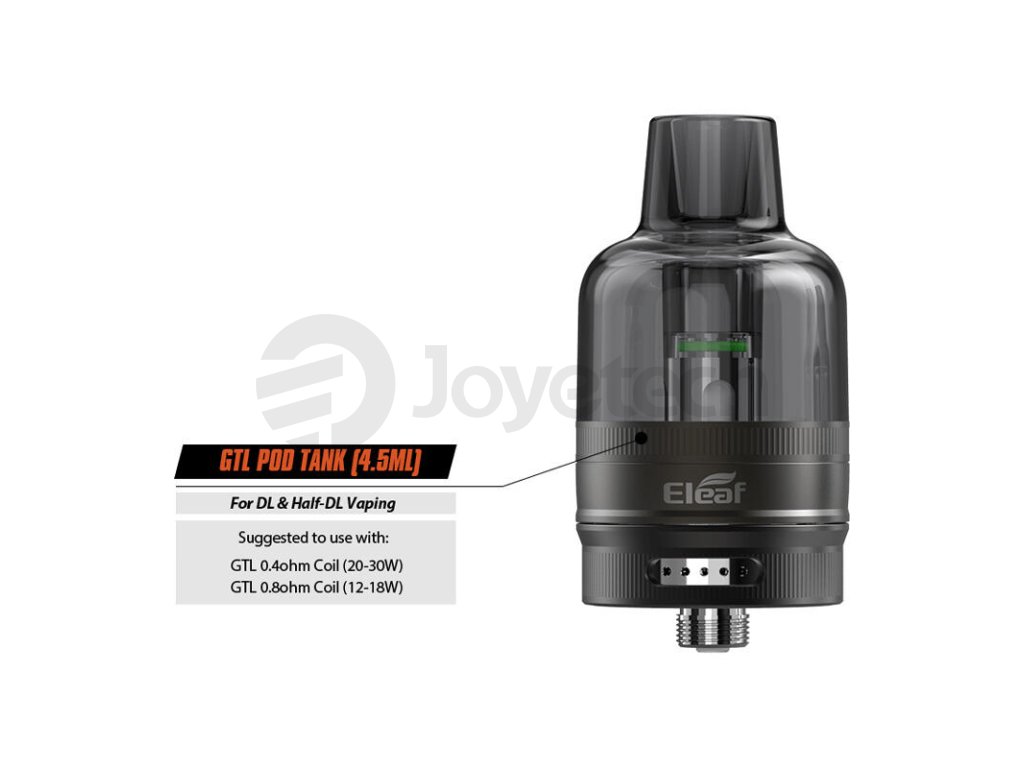 Upozornění: Clearomizér Eleaf GTL Pod Tank s objemem 4,5 ml je doporučeno používat se žhavícími tělísky Eleaf GTL s odpory 0,4 ohm a 0,8 ohm.