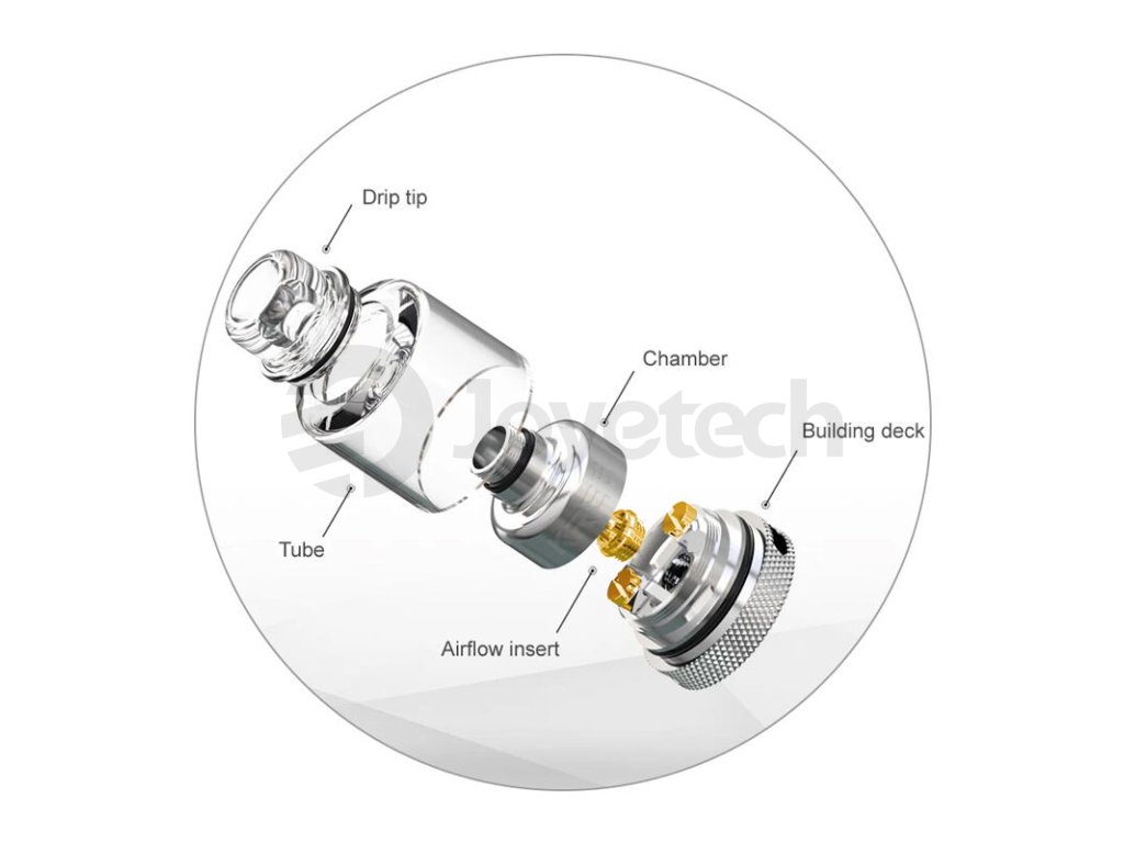 Ve spodní části se nachází neregulovatelný airflow systém, který doplňuje vnitřní vzduchová vložka. Ta se nachází přímo pod spirálkou a dá se dle potřeby měnit. V balení najdete čtyři vložky s různými průměry pro různou produkci páry. Všechny vložky nabídnou širší průměr, atomizér se zaměřuje na uživatele přímého potahování do plic (DL).