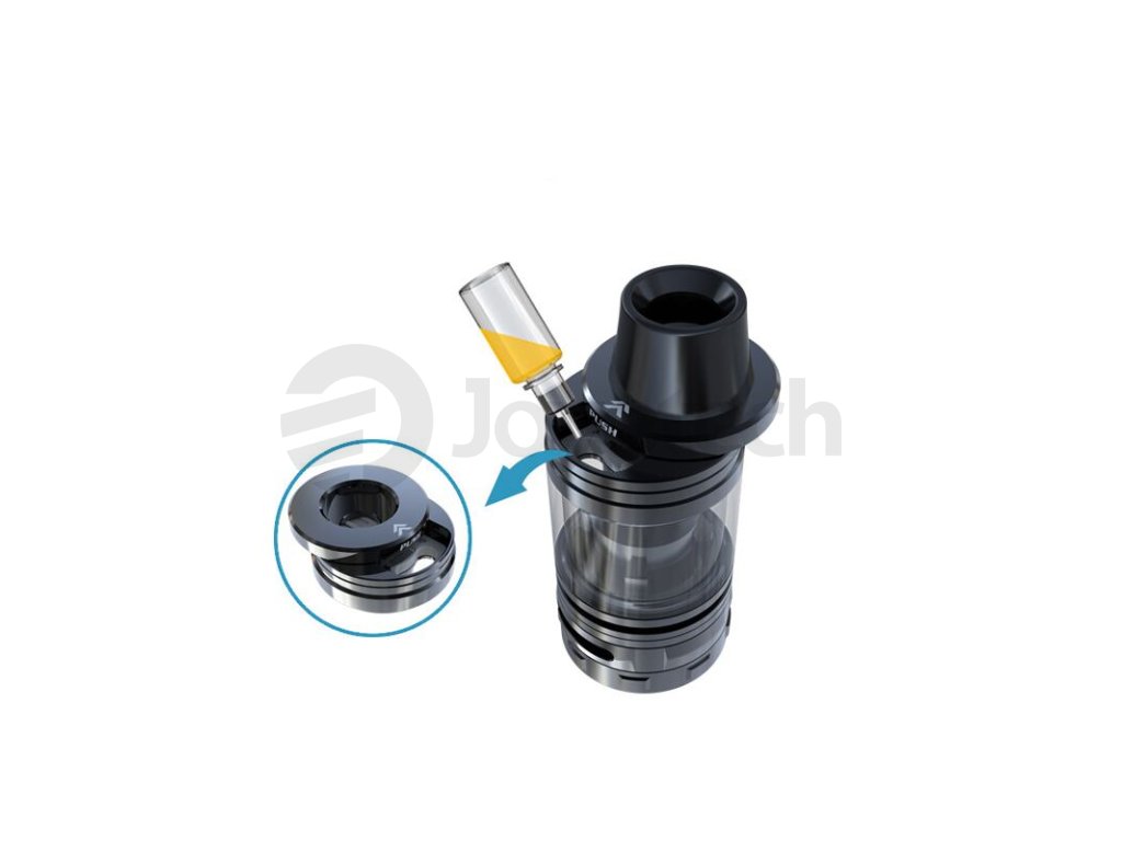 V balení najdete dvě žhavící hlavy CA-M2 s odporem 0,3 ohm. Obě zajistí velkou produkci páry a vynikající chuť e-liquidu. Ve vrchní části tanku najdete široký delrinový náustek a hlavně možnost pohodlného vrchního plnění e-liquidu. Stačí vysunout vrchní uzávěr lehce do strany a do pootevřeného otvoru doplnit e-liquid podle potřeby.
