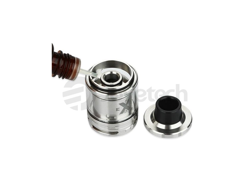 Základem EXO RTA je nerezové tělo s možností regulace sání a vrchním plněním. Speciální vnitřní kryt kotelny pak umožňuje nastavit množství přiváděného e-liquidu ke spirálce. K dispozici jsou hned dva typy velocity základny. První z nich má označení T1S a je přizpůsobena pro jednu spirálku. Naopak do T2S je možné připojit dvě spirálky a získat tak ještě lepší produkci páry. Obě dvě základny jsou součástí setu.
