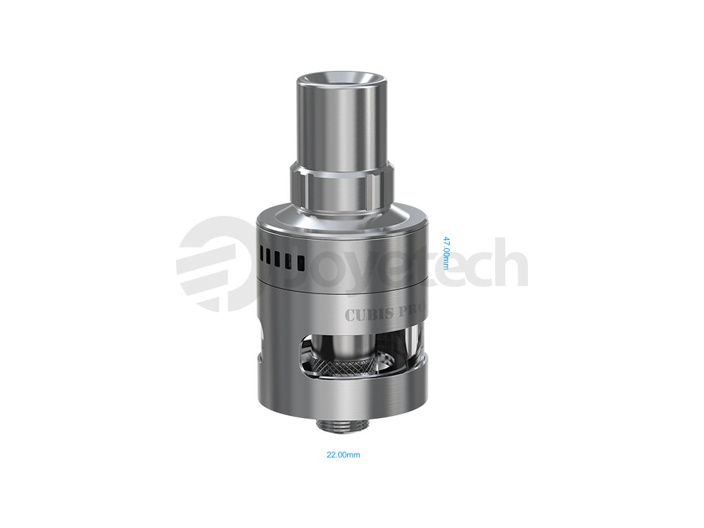 Jak už jeho název napovídá, jedná se o menši verzi clearomizeru CUBIS Pro. I přes sníženou kapacitu na 2ml, disponuje skvělou kouřivostí jako jeho větší předchůdce. Díky hornímu plnění nedochází k protékání liquidu na baterii.... po odšroubování vrchní části, která obsahuje atomizer, plníte liquid do samotného těla clearomizeru, kde není již žádný kouřovod, takže v plnění nic nepřekáží a liquid můžete do clearomizeru doslova nalít. Ve vrchní části se nachází i přívod vzduchu pro optimální prožitek z vapingu. Celý clearomizer je plně rozebíratelný a vyrobený z nerez oceli a Pyrexu. CUBIS Pro Mini spolupracuje s atomizery LVC Clapton ( úprava přívodu liquidu ke spirálce) a QCS ( snadná výměna bavlny při zachování nerezové trubičky s vyfrézovanými otvory = Notchcoil). Opět se můžeme spolehnout i na atomizery řady BF, BF Clapton = režim VW a BF SS316, který lze využit pro režim nastavování teploty.