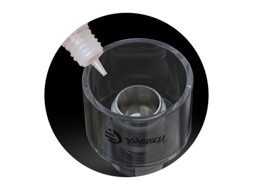 Novinkou je systém plnění e-liquidu. Jelikož se jedná o clearomizér, jehož vrchní část se skládá pouze z jednoho dílu, je zapotřebí plnit e-liquid spodem. Odšroubujte spodní základnu, otočte celé skleněné tělo vzhůru nohama a naplňte ho e-liquidem. Poté jen zašroubujte zpět základnu a žhavící hlavu a můžete začít vapovat. Do tanku lze doplnit e-liquid až do kapacity 2 ml. Ve spojení s touto příjemnou kapacitou tanku a stylovým designem se jedná o jeden z nejkrásnějších atomizérů na trhu.