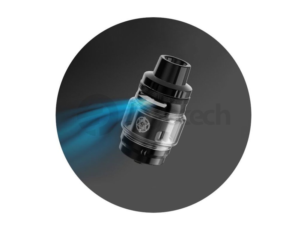 Nespornou výhodou je propracovaný systém regulace přívodu vzduchu, který se nachází v horní části atomizéru. Plynulým otáčením horního kroužku lze pohodlně a přesně doladit výslednou chuť a teplotu páry podle vašich preferencí. Horní systém zaručuje celkově optimálnějších výsledky při každém potahu díky efektivnější cirkulaci vzduchu uvnitř atomizéru a lepšímu odpařování liquidu, což ve výsledku znamená i věrnější podání chuti.