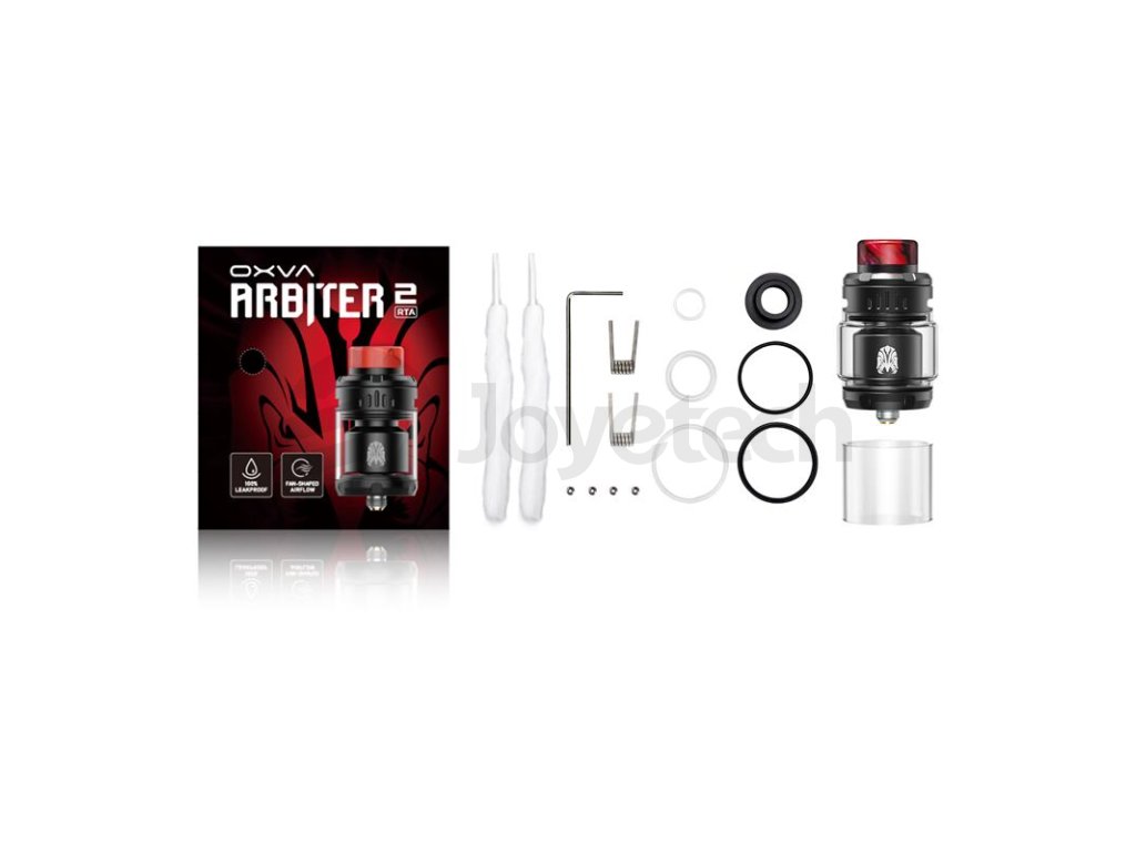 Arbiter je zpět a ve velkém stylu. Výrobce OXVA představuje clearomizér Arbiter 2 RTA, jedná se o druhou generaci populárního DL atomizéru Arbiter, přináší celou řadu výhod pro každodenní využití v čele s kompaktnějšími rozměry pro kompatibilitu s co největším množstvím modů na trhu. Ve spodní části atomizéru se nachází závit typu 510 s pozlaceným centrpinem. Délka atomizéru činí jen 52 mm, průměr potom činí 26 mm. Samotný objem tanku potěší všechny příznivce vzdušnějšího vapingu s větší spotřebou e-liquidu, do tanku lze doplnit až 5 ml e-liquidu, případně 3,5 ml s použitím menšího rovného skla. Pro plnění potom poslouží oblíbený vrchní systém plnění.