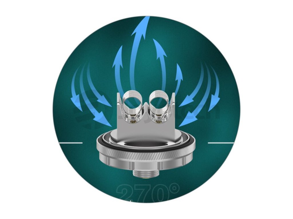 Poté, co vzduch vstoupí do atomizéru skrz vrchní airflow systém, proudí směrem k základně. Do základny je přiváděn ze spodní části, odkud také ofukuje samotné spirálky. Revoluční systém 270° Honeycomb, kterým je opatřena samotná základna, je skutečně dechberoucí. Atomizér si naprosto hravě poradí s kterýmkoliv e-liquidem. Ať už preferujete jednosložkové náplně, nebo složité a komplexní ovocné a dezertové směsi, všechny chutě vykreslí naprosto dokonale.