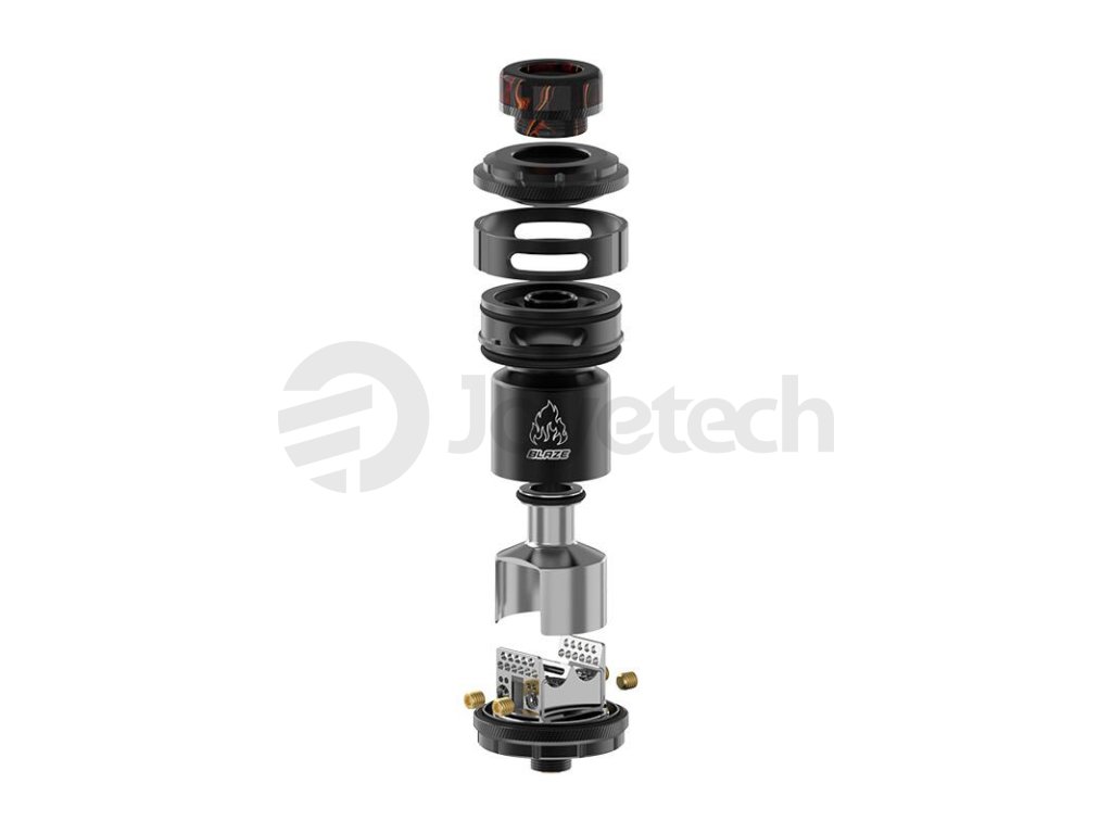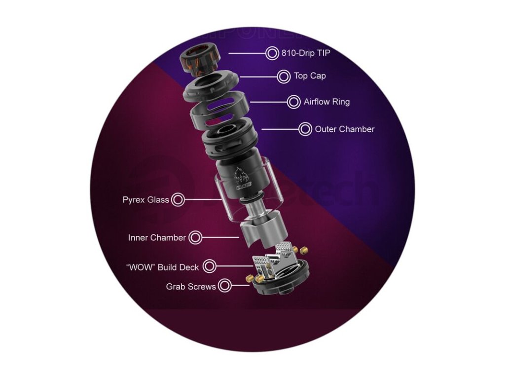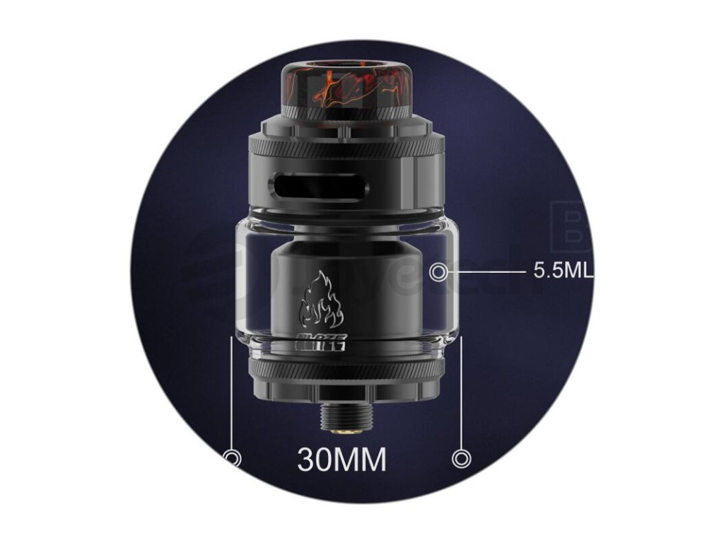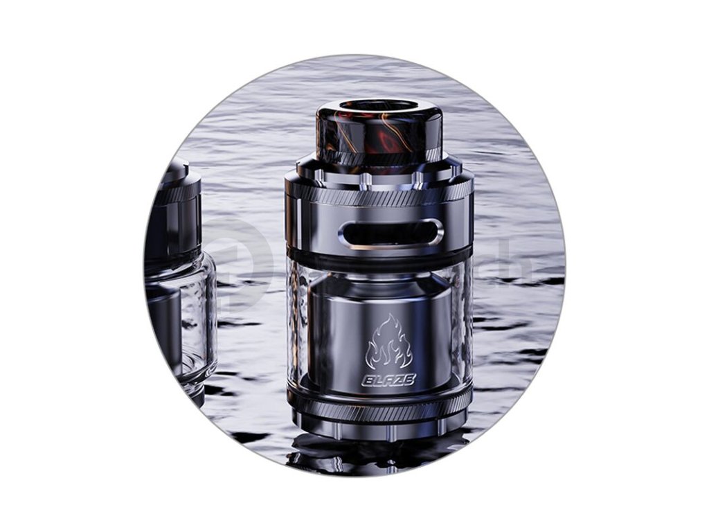 Základní objem tanku činí 2 ml, tuto kapacitu si však budete moci pohodlně navýšit až na 5,5 ml osazením většího pyrexového těla z balení. Mimo obrovskou kapacitu disponuje atomizér také oblíbeným systémem vrchního doplňování. V těle se potom nachází inovativní "WOW" základna pro instalaci dvou spirálek souběžně. Tato základna zároveň nabídne unikátní systém přívodu vzduchu s názvem 270° Honeycomb. Vzduch je přiváděn řadou menších otvorů pod spirálky, odkud poté proudí směrem nahoru do komory. Výsledná chuť je doslova ohromující. Samotnou tuhost potahu si poté můžete ještě regulovat pomocí vrchního systému airflow. THC Blaze RTA je ve všech směrech promyšlený DL atomizér, se kterým se nebudete ani na vteřinu nudit. Zaručeně splní požadavky i těch nejnáročnějších příznivců přímého potahování do plic.