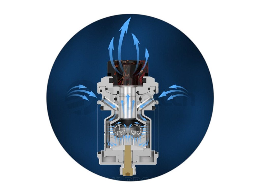 Poté, co vzduch vstoupí do atomizéru skrz vrchní airflow systém, proudí směrem k základně. Do základny je přiváděn ze spodní části, odkud také ofukuje samotné spirálky. Revoluční systém 270° Honeycomb, kterým je opatřena samotná základna, je skutečně dechberoucí. Atomizér si naprosto hravě poradí s kterýmkoliv e-liquidem. Ať už preferujete jednosložkové náplně, nebo složité a komplexní ovocné a dezertové směsi, všechny chutě vykreslí naprosto dokonale.