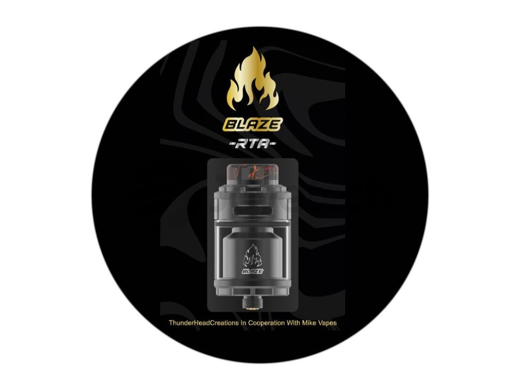 Světoznámý výrobce vaperského hardwaru Thunderhead Creations spojil síly s americkým recenzentem Mike Vapes a společnými silami dali dohromady prvotřídní motací RTA atomizér pro přímé potahování do plic s řadou inovativních prvků a skvělých funkcí pro každodenní vaping. Clearomizér THC Blaze RTA zaujme zejména svým robustním dílenským zpracováním, ale také nesmírně detailním a promyšleným airflow systémem pro zisk maximálního množství plné a prokreslené chuti během vapování. Tělo atomizéru je vyrobeno z vysoce kvalitní nerezové oceli a borosilikátového skla tanku. Délka atomizéru činí 44,5 mm bez náustku a závitu, průměr se potom zastavil na 26 mm ve vrchní části a na 24 mm v části u základny. Spodní část atomizéru je opatřena standardním závitem typu 510, díky čemuž je kompatibilní s drtivou většinou modů na trhu.