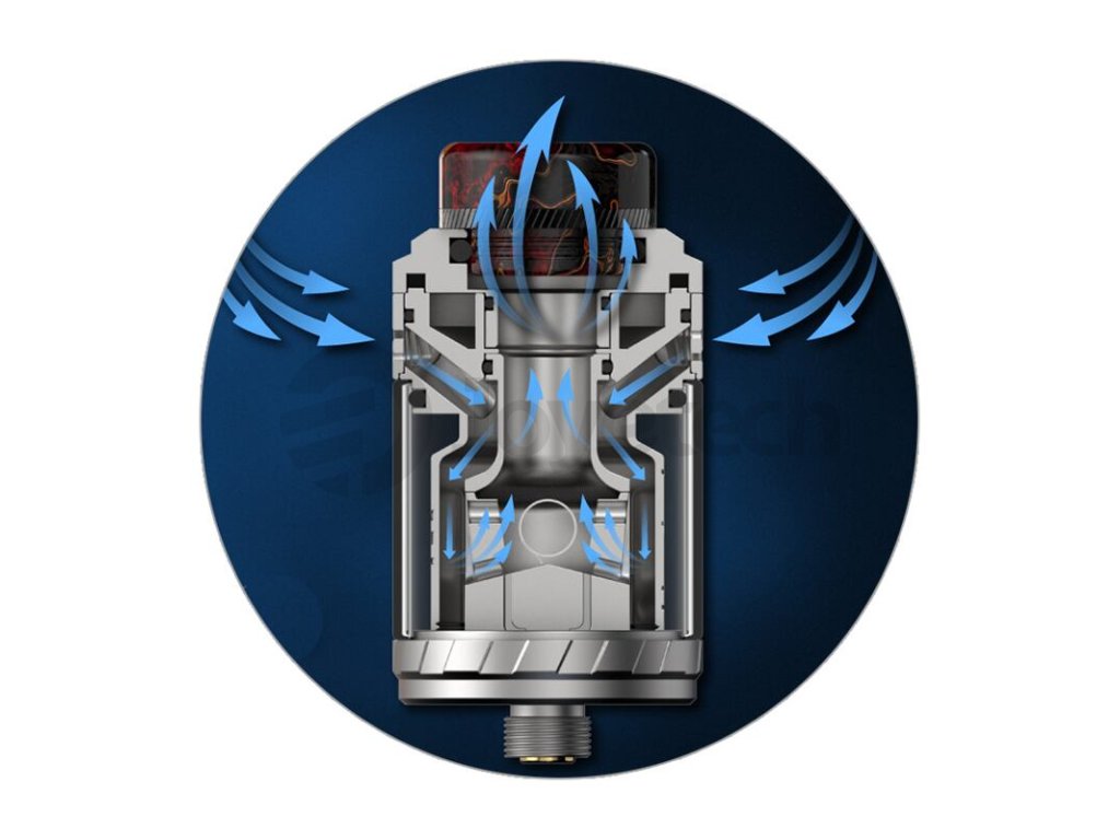V jádru se potom nachází bezsloupková základna pro instalaci jedné spirálky s postranními děrovanými panely pro efektivní přívod vzduchu přímo ke spirálce. Díky těmto otvorům je spirálka ofukována ve velice krátké dráze, díky čemuž vykouzlíte z atomizéru maximálně plnou a výraznou chuť. Systém regulace přívodu vzduchu je umístěn ve vrchní části, je plně regulovatelný a nabídne široké možnosti nastavení tuhosti potahování. Do detailu vypiplaný atomizér ocení hlavně milovníci vzdušnějších forem potahu, hodí se zejména na středně tuhý DL vaping. Nabídne jednoduchou a přívětivou uživatelskou obsluhu, krásné zpracování a efektivní konstrukční vlastnosti pro zisk chutné a husté páry.