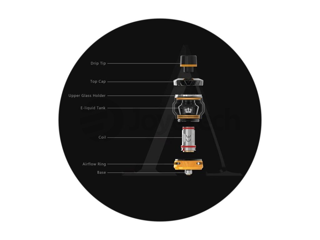 Uwell Crown V Tank je novým korunovaným králem na poli DL atomizérů na standardní žhavící hlavy. A právě designem tradiční královské koruny byl inspirován také samotný design atomizéru. Ten nabídne elegantní zpracování, kvalitní použité materiály a robustní konstrukci s délkou 51 mm a průměrem 29 mm. Královskou korunou je ozdobená také vnitřní komora. S tímhle atomizérem zaručeně vždy vyniknete.