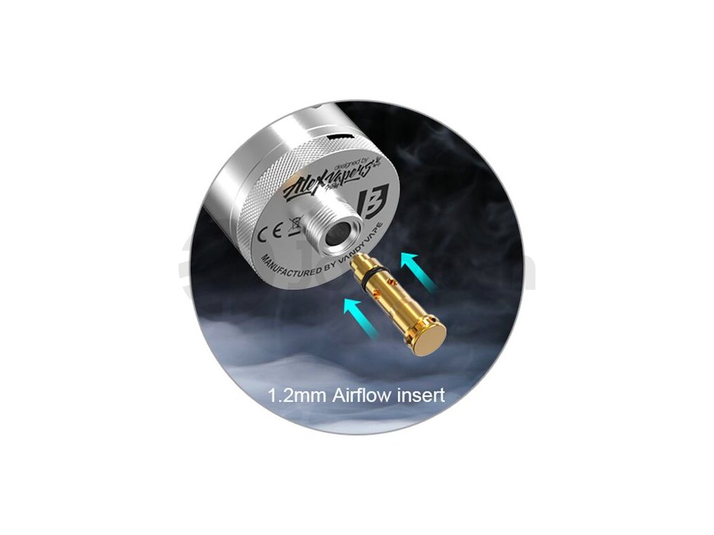 Atomizér Vandy Vape BSKR Mini V3 nabídne inovativní metodu regulace přívodu vzduchu. Otvor pro přísun vzduchu ke spirálce je umístěn přímo v centrpinu, který je odnímatelný. Jednoduše ho tak můžete vyšroubovat a nasadit jiný centrpin s jiným průměrem vzduchového otvoru. V základní konfiguraci je atomizér osazen centrpinem se vzduchovým otvorem 1,2 mm, v balení na vás potom čekají čtyři další centrpiny s průměry vzduchu 0,8 mm, 1,0 mm, 1,6 mm a 2,0 mm.