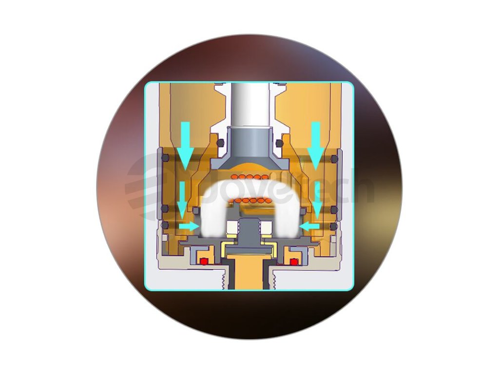 Spodní část atomizéru ukrývá praktickou základnu se dvěma protilehlými sloupky, do které je možné nainstalovat jednu spirálku dle vlastního výběru. Atomizér si poradí s drtivou většinou spirálek, nabídne snadné uchycení pomocí dvou šroubků a pohodlnou instalaci, se kterou si budou rozumět také začátečníci. Celý atomizér potom zvládnete osadit za pár minut.