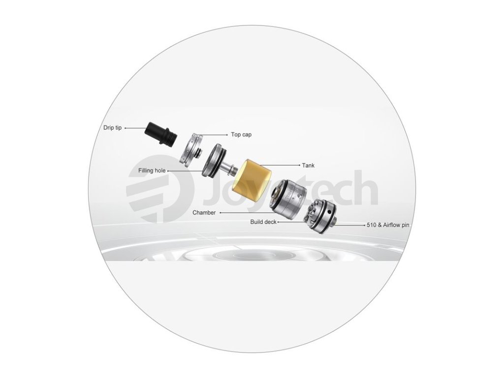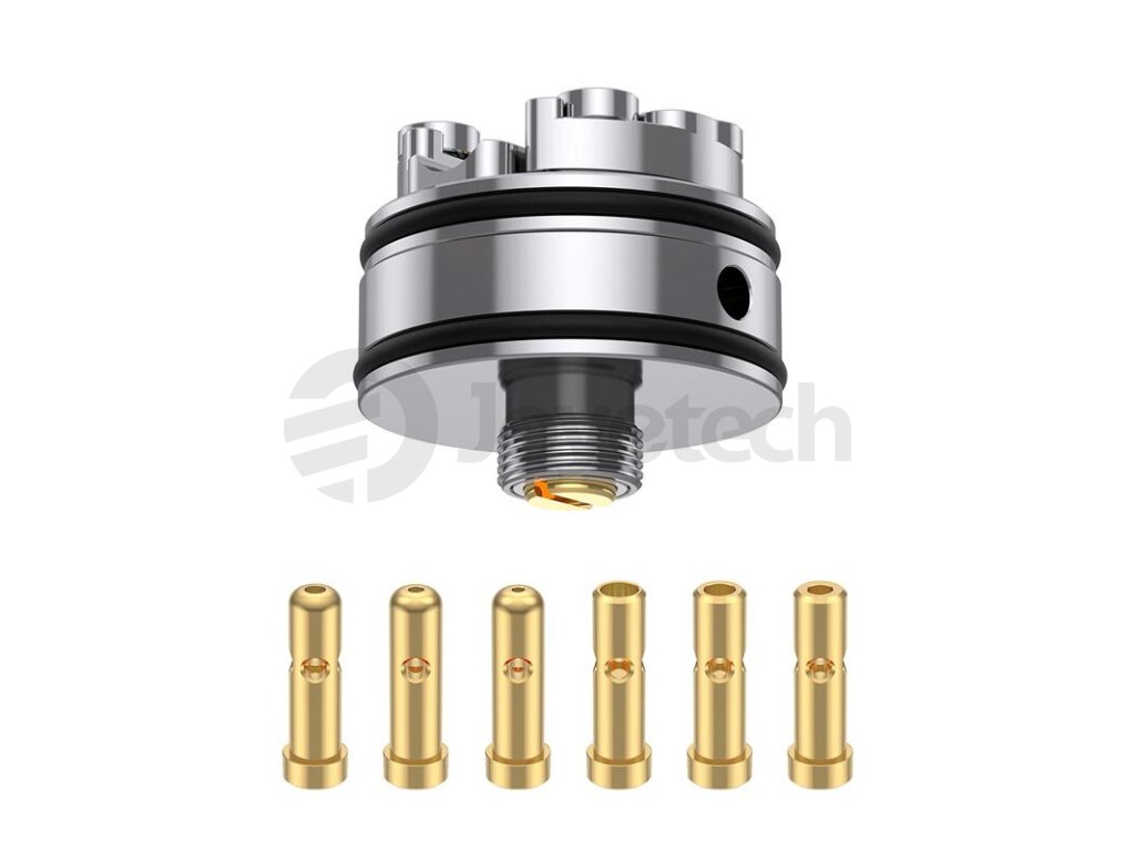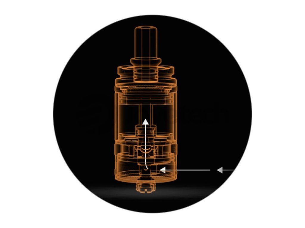 Systém pro přísun vzduchu se nachází ve spodní části. Přímo pod základnou se nachází kroužek pro regulaci, celkový vstup vzduchu pak můžete ještě dotáhnout pomocí vzduchových vložek, které se instalují do závitu 510 ve spodní části. V balení na vás čekají vložky s průměry 0,8 mm, 1,0 mm, 1,3 mm, 1,6 mm, 2,0 mm a 2,5 mm, možnosti jsou tak velice rozsáhlé.