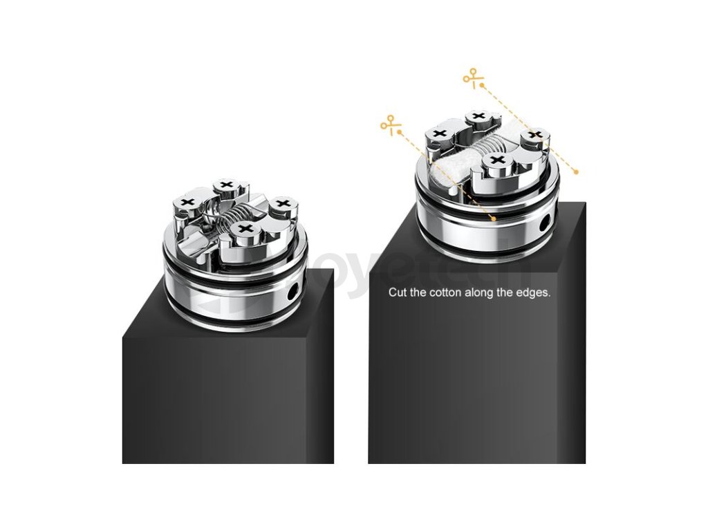 Uvnitř atomizéru na vás čeká praktická základna se dvěma protilehlými sloupky, do kterých je možné nainstalovat jednu spirálku. Jedná se o základnu v provedení single coil, s instalací si poradí naprosto každý milovník DIY. Instalace zabere jen pár vteřin. Základna navíc nabídne také dostatek prostoru pro snadné osazení vatou.