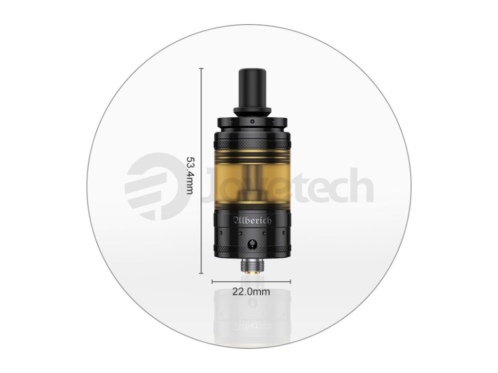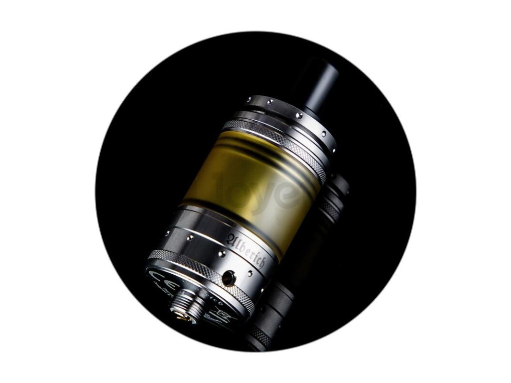 Vapefly Alberich MTL RTA je kvalitně zpracovaný atomizér s nádherným designem a stylovým kovovým tělem. Na pohled působí robustním, přesto však také elegantním dojmem. Jeho délka činí 53,4 mm a průměr se zastavil na 22 mm. Díky těmto rozměrům si bude rozumět s drtivou většinou modů na současném trhu. Samozřejmostí je potom závit typu 510 ve spodní části.
