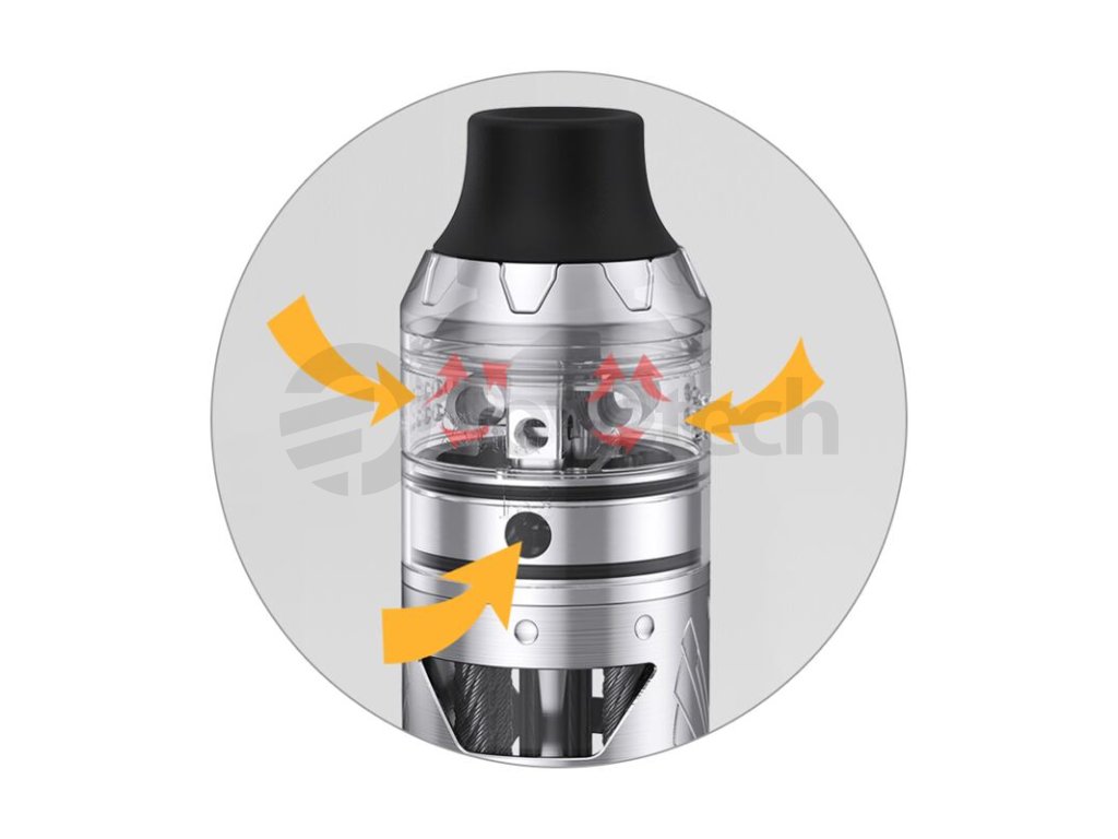 Pro zisk maximálně prokreslené chuti je clearomizér Brunhilde 1o3 vybaven pokročilým systémem airflow. Spirálky u atomizéru jsou ofukovány pomocí bočního systému, který tvoří celá řada menších otvorů pro rovnoměrný ofuk. U základny se pak navíc nachází speciální vzduchová vložka pro nasávání vzduchu také pod spirálky. Tato vložka je vyměnitelná, v základním balení najdete hned dvě rozdílné vložky, které vám zprostředkují rozdílný styl DL potahu.