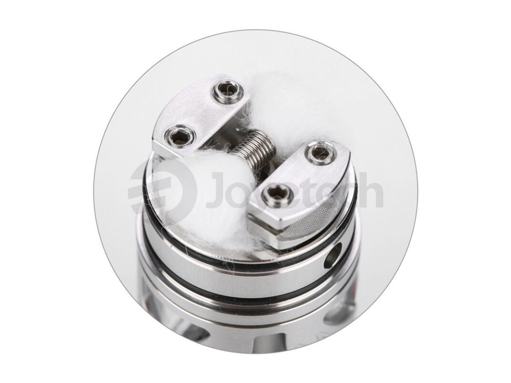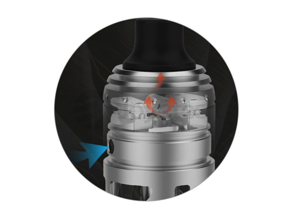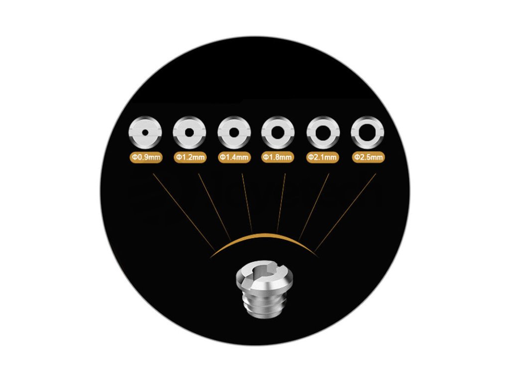 Přímo pod spirálkou se nachází otvor pro vstup vzduchu do atomizéru. Díky umístění pod spirálkou je spirálka ofukována efektivně a vždy tak dosáhnete perfektní chuti. Jelikož se jedná o MTL atomizér, připravil si výrobce široké možnosti nastavení tohoto přívodního otvoru. V balení tak najdete redukční sadu tvořenou šesti šroubky s různými průměry otvoru pro zvolení optimální tuhosti potahu. Na výběr budete mít průměry 0,9 mm, 1,2 mm, 1,4 mm, 1,8 mm a dva širší průměry 2,1 mm a 2,5 mm.