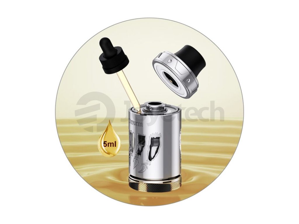 Vzhledem k využití pro DL potahování zvolil výrobce větší kapacitu tanku, aby nedocházelo k častému úbytku e-liquidu. U atomizéru Lindwurm RTA se tak můžete těšit na obrovský tank s objemem 5 ml. S touto kapacitou si poradí také s intenzivním užíváním bez potřeby častého plnění. V případě nutnosti pak jen pootočíte uzávěrem a během pár vteřin si doplníte e-liquid zpět.
