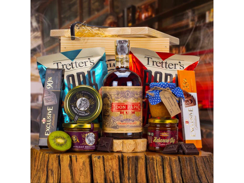 Dárková bedna Don Papa zapůsobí i na náročnějšího oslavence. Tento filipínský rum má dlouhou tradici a není divu, že je jedním z nejoblíbenějších rumů. Chutná totiž naprosto skvěle a doplněný o dobroty různých chutí a vůní zajistí opravdový požitek. Zvláště pokud si ho obdarovaný musí z bedny pomocí páčidla zasloužit. Radost určitě udělají například vyladěné kančí a pytlácké rillettes nebo křupavé vepřové škvarky. Jiné chuťové pohárky zase potěší čokoláda Taitau Exclusive Selection, vyrobená z nejkvalitnějších ghanských kakaových bobů.