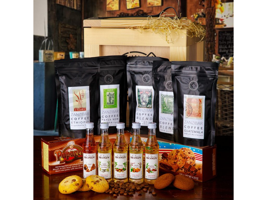 Kvalitní káva má nejen povzbuzující účinky, ale také potěší chuťové buňky. Pokud hledáte dárek pro někoho, kdo si rád tento nápoj dopřeje, bedna Kafař bude ideální volbou. Obdarovaný si dřevěnou bednou vypáčí přiloženým páčidlem a probojuje se tak k bohatému obsahu. V bedně nalezne pět druhů zrnkové kávy původem z Guetemaly, Etiopie nebo třeba z Kolumbie. Kávu si může dochutit sirupy Monin a k ní ochutnat cookies s oříškovým krémem nebo sušenky s čokoládovou náplní.