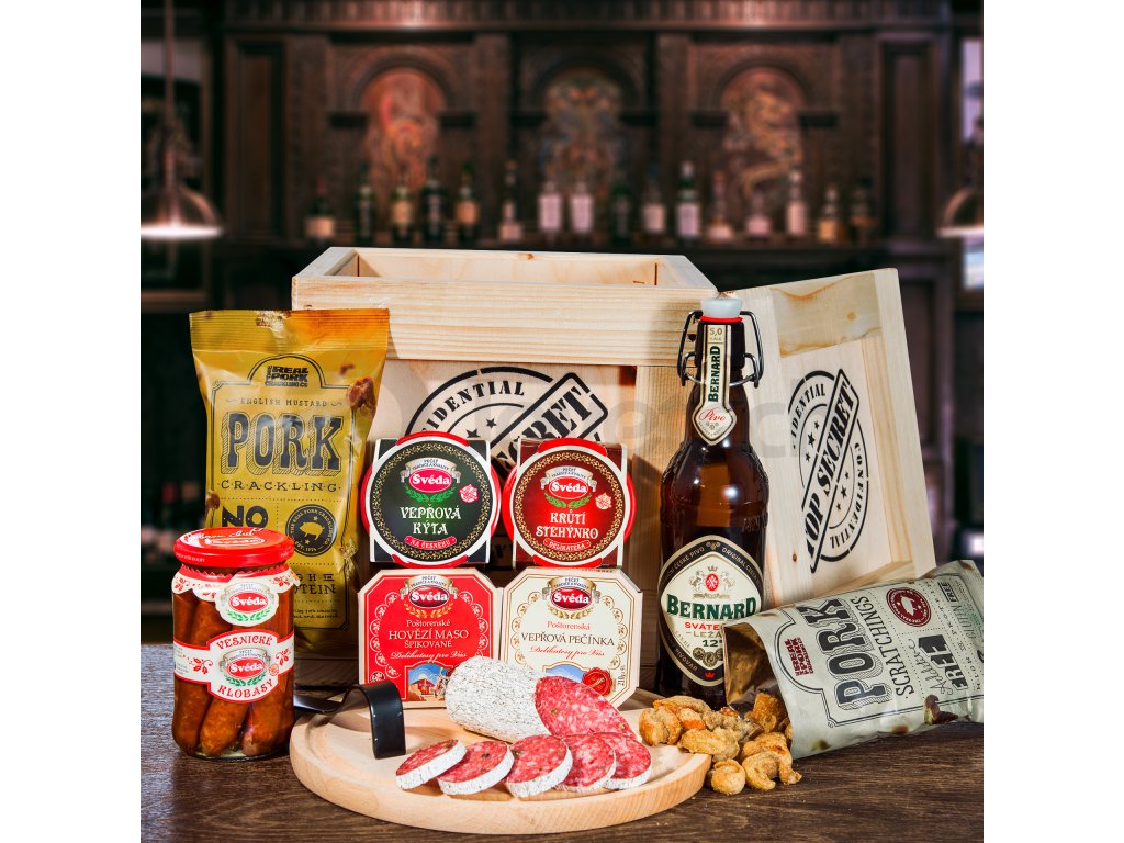 Hledáte dárek pro někoho, kdo více než alkohol ocení dobré jídlo? Dřevěná bedna s páčidlem Labužník potěší všechny milovníky jídla a masa. Všechny produkty, které jsou součástí bedny maso obsahují a to ve všech možných zpracováních. Bedna obsahuje čtyři druhy masových specialit ve skle a to krůtí stehýnko, hovězí maso špikované, vepřovou pečínku a vepřovou kýtu na česneku, které jsou výborně dochucené. Gurmánský zážitek doplňují vesnické klobásky a aby to křuplo, součástí bedny jsou i vepřové škvarky dvou příchutí. Posledním produktem v bedně je chutný salám Saturn. Obdarovaný si užije zábavu při páčení bedny a následně se může odměnit dárkem pro pravého chlapa.