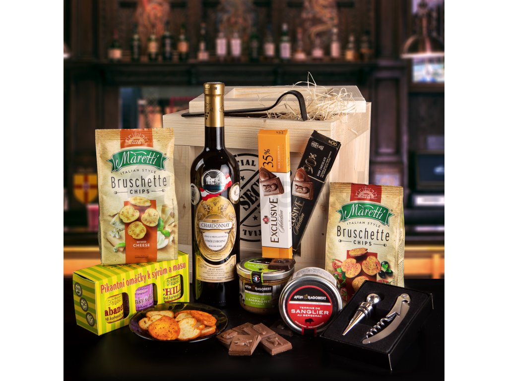Darujte výborné bílé víno v dřevěné bedně s páčidlem, oslavenec tak dostane nejenom hodnotné produkty, ale také zábavu při samotném páčení. Vinařství Krist vyrábí vysoce kvalitní přívlastková vína, jejich Chardonnay proto udělá radost každému, kdo nepohrdne sklenkou bílého. S otevřením si nemusíte dělat hlavu, protože i na to jsme mysleli a součástí bedny je dvoudílná sada na víno. Dále chuťové pohárky potěší například Trio box, který obsahuje pikantní omáčky k sýru a masu, dvě příchutě Maretti bruschett nebo třeba čokoláda z nejkvalitnějších ghanských kakaových bobů.
