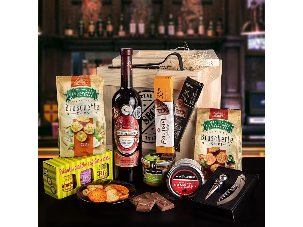 Darujte výborné červené víno v dřevěné bedně s páčidlem, , oslavenec tak dostane nejenom hodnotné produkty, ale také zábavu při samotném páčení. Vinařství Krist vyrábí vysoce kvalitní přívlastková vína, jejich Rulandské modré proto udělá radost každému, kdo nepohrdne sklenkou červeného. S otevřením si nemusíte dělat hlavu, protože i na to jsme mysleli a součástí bedny je dvoudílná sada na víno. Dále chuťové pohárky potěší například Trio box, který obsahuje pikantní omáčky k sýru a masu, dvě příchutě Maretti bruschett nebo třeba čokoláda z nejkvalitnějších ghanských kakaových bobů.