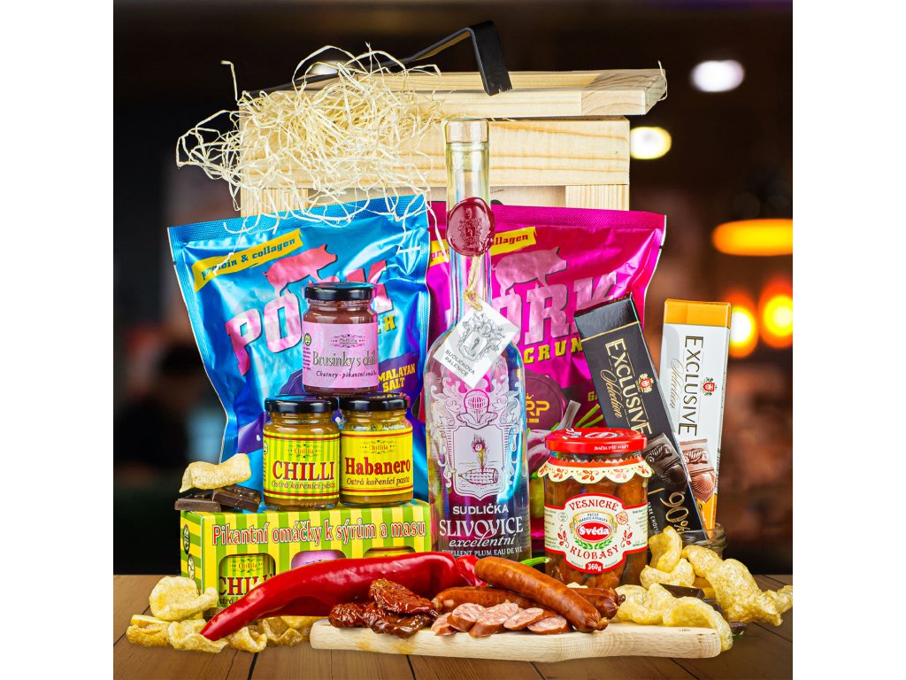 Darbox bedna Slivovice, která je pravděpodobně nejoblíbenějším ovocným destilátem nejen v České republice snad ani nemusíme představovat. Rádi vám ale představíme Sudličkovu slivovici, která je královnou naší dřevěné dárkové bedny s páčidlem. Lihovar při její výrobě velmi dbá na výběr zralých švestek, aby v připraveném kvasu bylo jen to nejlepší ovoce. Ovoce pak nechávají přirozeně kvasit, aby výsledek stál za to. Obdarovaný také nalezne v bedně tématické Chutney ze sušených švestek, může zakousnout křupavé vepřové škvarky a další dobroty.