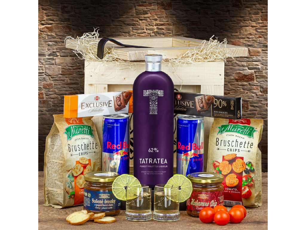 Tatranský čaj byl v minulosti považován za medicínu, která zahřála nemocné i promrzlé horaly při návratu z hor. Dnes ho můžeme ochutnat pod značkou Tatratea a zahřát se tak tímto likérem na bázi čaje a bylinek i my. V dřevěné bedně s páčidlem naleznete Tatratea 62%, který je vyroben z čaje a extraktu lesních plodů. Vychutnat si ho můžete ze dvou malých originálních skleniček, doplnit ho Red Bullem a nechybí občerstvení v podobě například dvou příchutí bruschett, chutney ze sušených švestek, čokolád a Habanero dipu. Bednu si oslavenec otevře přiloženým páčidlem, což dokáže skvěle zpestřit rodinnou oslavu, večírek či jinou příležitost a zasloužený dárek tak udělá větší radost.