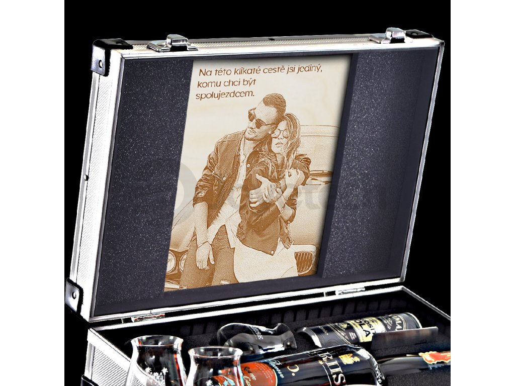 Vaše nápady rádi umístíme do víka dárkového kufru. Překvapit můžete gravírováním na stylové plexi, nebo dřevěné desce, nebo oblíbenou fotografií doplněnou jedinečným přáním.