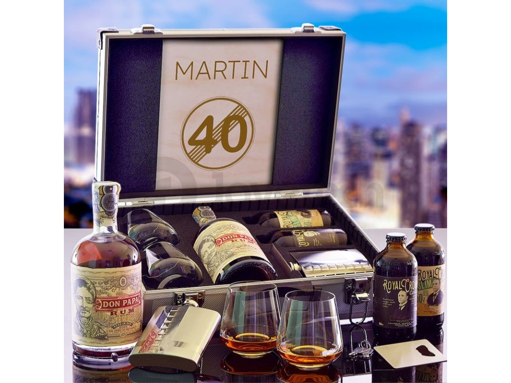 1x Hliníkový kufr. Složení Kufr je opatřen plastovými rohy a pevným madlem. 1x Nerezový otvírák na láhve 2x sklenička na rum. Složení 1x Don Papa 0.7l. Složení: Obsah alkoholu 40%. Země původu Filipíny. 1x Royal Crown Cola. Složení: 250 ml 1x Royal Crown Slim Cola. Složení: 250 ml 1x Nerezová placatka. Složení: |