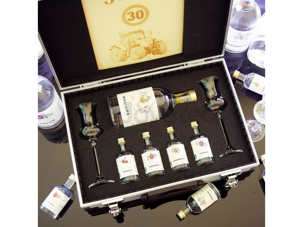 1x Hliníkový kufr. Složení Kufr je opatřen plastovými rohy a pevným madlem. 2x Degustační sklenice na pálenku 1x Meruňkovice 0,5l.Složení Obsah alkoholu 47%, Země původu ČR. 1x Hruškovice 0,05l.Složení Obsah alkoholu 47%, Země původu ČR. 1x Višňovice 0,05l.Složení Obsah alkoholu 47%, Země původu ČR. 1x Jablkovice 0,05l.Složení Obsah alkoholu 47%, Země původu ČR. 1x Slivovice 0,05l.Složení Obsah alkoholu 47%, Země původu ČR. |