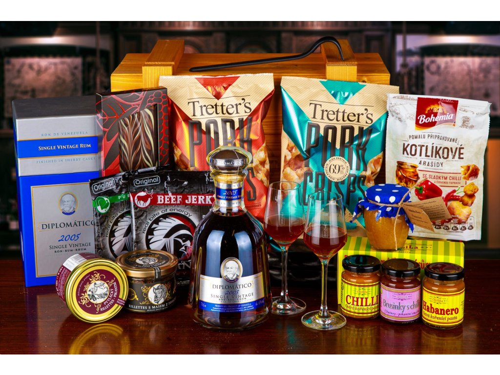 1x Dřevěná bedna Top Secret 40x30x20 cm 1x Ocelové páčidlo 1x Diplomático Single Vintage 2007 0,7 l. Obsah alkoholu 43 %. Země: Venezuela 2x Sklenička na rum Diplomatiko. Objem 0,2 l 1x Kančí rillettes, 180g. Složení: maso z divočáka 30%,vepřové maso, vepřová kůže, vepřové sádlo, červené víno, sušená švestka, pitná voda, koření: bobkový list, jalovec, rozmarýn, sůl. Nutriční hodnoty na 100g výrobku : energetické hodnoty 1161,8lJ/268,9kcal, tuky 20,53 z toho nasycené mastné kyseliny 3,75g, sacharidy 3,2g, z toho cukry 1,91g, bílkovina 17,94g, sůl 0,12g. 1x Pytlácký rillettes, 180g. Složení: maso z divočáka 30%, vepřové maso, vepřová kůže, vepřové sádlo, červené víno, pitná voda,Koření: bobkový list, jalovec, rozmarýn, chilli paprička, sůl. Nutriční hodnoty na 100g výrobku : energetické hodnoty 1161,8lJ/268,9kcal, tuky 20,53g, z toho nasycené mastné kyseliny 3,75g, sacharidy 3,2g, z toho cukry 1,91g, bílkovina 17,94g, sůl 0,12g. Vyrobeno v ČR 2x Sušené maso Jerky 25gr. Složení: maso, jedlá sůl, sůl z mrtvého moře, cukr, bílkovinný sojový hydrolyzát, kvasničný extrakt, vinný ocet, barvivo: karamel, dextróza, pepř, maltodextrin, česnek, aroma, kouřové aroma, konzervant: dusitan sodný. Alergeny: sója. Vyrobeno v ČR 1x Trio box. Pikantní omáčky k sýru a masu 3x40ml. Složení: Habanero ostrá pasta, brusinky s chilli, Chutney chilli-chilli. Neobsahují konzervační látky ani umělá barviva. 1x Křupavé vepřové škvarky s bylinkami 75g.Složení:Vepřová kůže, sůl, výtažek z kvasnic, rýžová mouka, přírodní aromata, cukr, koření (kopr, paprika, pískavice), bylinky (tymián).Průměrné hodnoty na 100g:Energie 2672kJ / 644kcal, tuky 51.7g, z nichž 18.3g jsou nasycené tuky, sacharidy 0.5g, z nichž cukry 0.5g, bílkoviny 44.5g, sůl 3.9g 1x Křupavé vepřové škvarky s příchutí hořčice 75g. Složení:Vepřová kůže, sůl, výtažek z kvasnic, rýžová mouka, přírodní aromata, cukr, koření (kopr, paprika, pískavice), bylinky (tymián).Průměrné hodnoty na 100g:Energie 2672kJ / 644kcal, tuky 51.7g, z nichž 18.3g jsou nasycené tuky, sacharidy 0.5g, z nichž cukry 0.5g, bílkoviny 44.5g, sůl 3.9g 1x Exklusivní Tříbarevná čokoláda z kvalitní belgické čokoládové hmoty. Český výrobek. Hmotnost 120g, š 10cm, V28cm. Složení: kakaová hmota 52,6%, cukr 39%, kakaové máslo 5,4%, sušené mléko 2,4%, emulgátor-sojový lecitin 0,5%, aroma-přírodní vanilka 1x Bohemia Kotlíkové arašídy se sladkým chilli a červenou paprikou 150g. Složení Arašídy (40 %), Rýžová mouka, Kukuřičný škrob, Slunečnicový olej (10 %), Pšeničná mouka, Cukr (4,4 %), Jedlá sůl, Kurkuma, Sušená rajčata, Sušená cibule, Přírodní aroma, Sušená paprika (0,4 %), Výtažek z kvasnic, Kypřicí látky (difosfaty, jedlá soda), Chilli (0,2 %), Pšeničný škrob, Moučkový cukr, Sušený česnek, Barvivo (paprikový extrakt), Invertní cukr 1x Domácí marmeláda. Složení Pomeranč s vanilkou a filipínským rumem. Složení: pomeranč 84%, cukr, citronová šťáva, agar, Don Papa rum, tapiokový škrob, vanilka. |