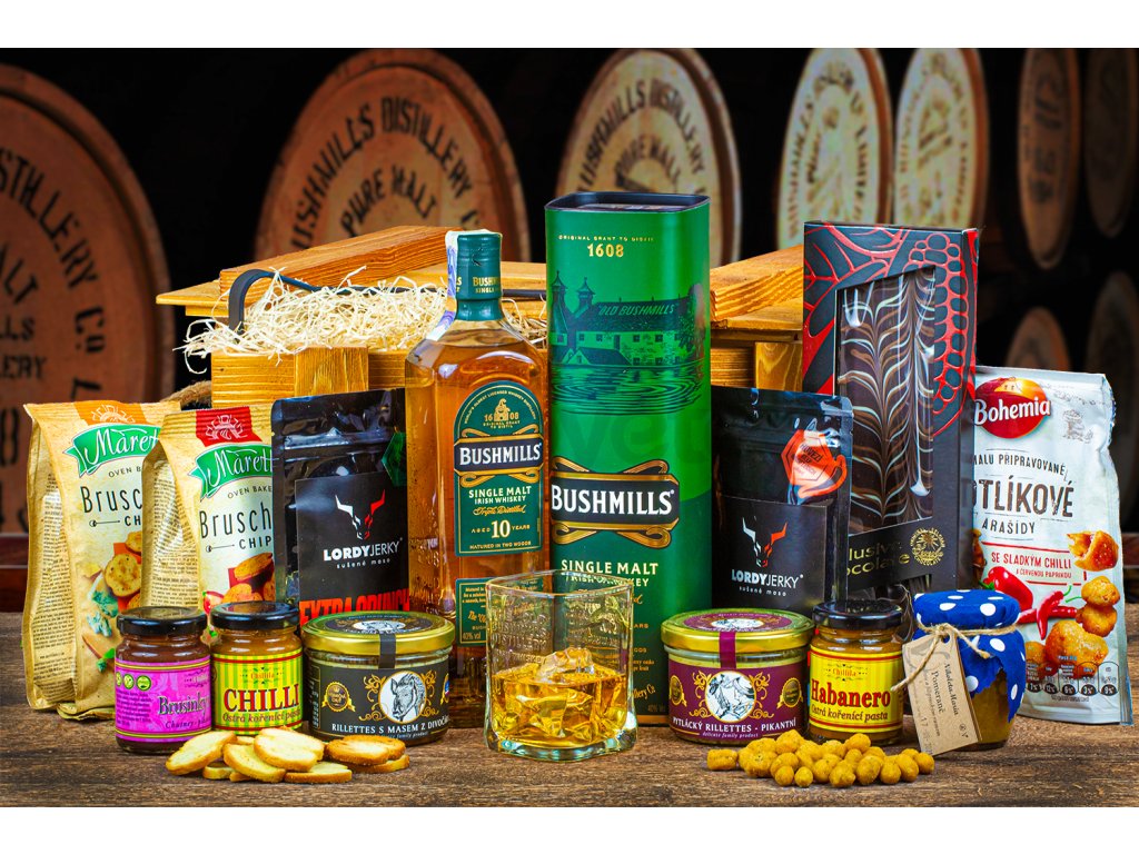 Exkluzivní bedna s páčidlem je určená pro ty, kteří chtějí udělat dárkem opravdu dojem. Zaujme nejenom svým vyladěným vzhledem, ale taky velmi bohatým obsahem. Dominantou bedny je láhev whisky Bushmills 10 Y.O. Single Malt, která pochází z nejstarší licencované irské palírny. Tato whisky je třikrát destilována za použití 100% ječného sladu a zrála minimálně 10 let v sudech po bourbonu. V bedně ji naleznete společně se skleničkou Bushmills Single Malt a spoustou výborných dobrot. Udělá tak radost třeba partnerovi, tatánkovi nebo třeba dědečkovi.