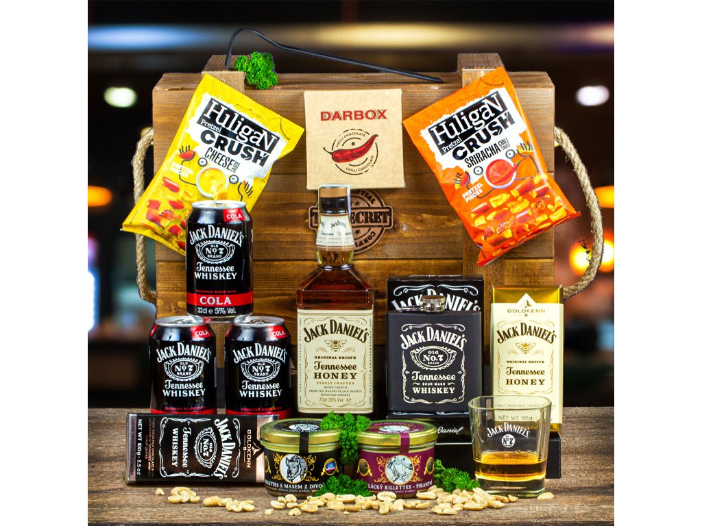 Jack Daniels je nejprodávanější americká whisky na světě. Vyrábí se v palírně v Lynchburgu, která se může pyšnit tím, že je první zaregistrovanou palírnou v USA. Za 150 let si chuť této whisky oblíbil celý svět a proto v naší dřevěné bedně nesmí chybět. Spolu s Jackem si pochutnáte i na hovězím sušeném masu, BBQ omáčce, která byla vyrobená z této whisky a mléčnou čokoládou taktéž plněnou stejnojmennou whisky. Nechybí ani dva již umíchané drinky Jack Daniel´s & Cola. Všechno naleznete v pečlivě zabalené dřevěné bedně doplněné o páčidlo, ať zábava může začít.