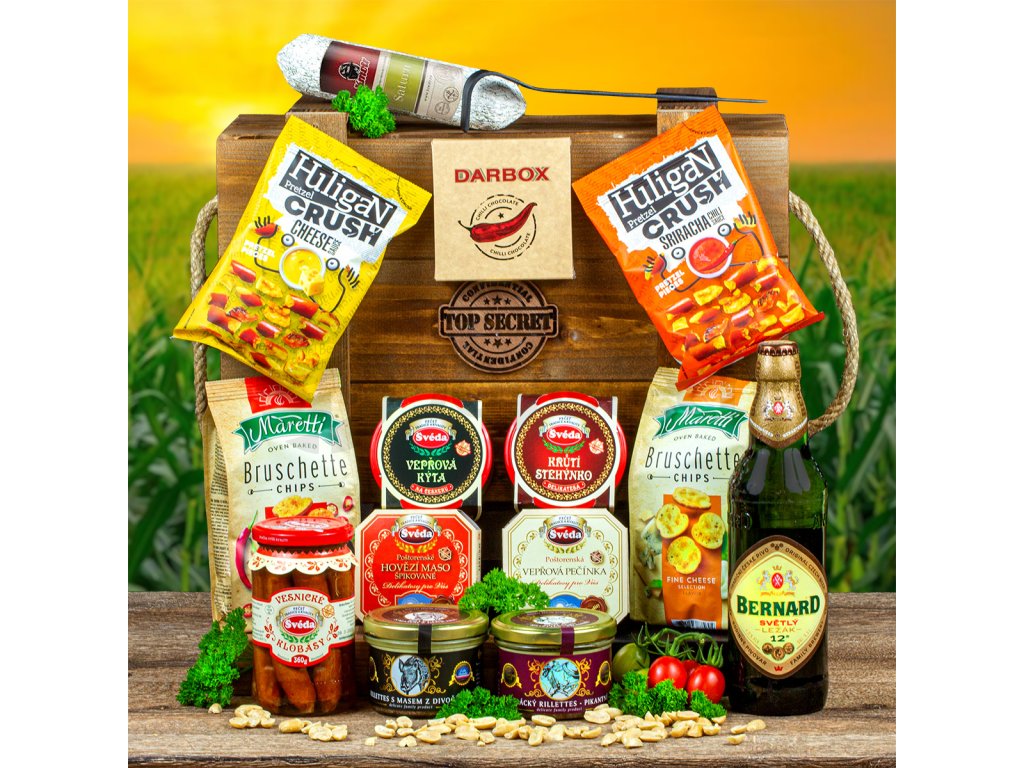 1x Dřevěná bedna Top Secret 40x30x20 cm. 1x Ocelové páčidlo. 1x DÁREK ZDARMA!!! Pivo světlý ležák 12° Bernard, Obsah alkoholu: 5 % obj. Země původu ČR 1x Salám Kmotr Saturn 250g. Složení:Vepřové maso, vepřové sádlo, hovězí maso, jedlá sůl (max. obsah 4,2%), vepřové kůže, koření, zelený pepř (1,8 %), dextróza, startovací kultura mikroorganismů, konzervant (E 250), červená řepa, antioxidant( E 316), barvivo (E 120). Na 100g výrobku bylo použito 120g masa. Obsah tuku max. 55%. Nejedlé střívko.Alergeny Nejsou přítomny. 1x Krůtí stehýnko delikatesa 200 g. Výrobce: Švéda. Složení: Krůtí stehenní steak 150g, voda, vepřové kůže, solící směs (jedlá sůl, konzervant E250), zahušťovadlo karagenan, jedlá sůl, dextróza, látka zvýrazňující chuť a vůni glutaman sodný, extrakty koření. Hodnoty hmotnosti uvedeny před tepelným opracováním. Alergeny: NE. Výživové údaje na 100g výrobku: energetická hodnota 369kJ/88kcal, tuky 3,3g, z toho nasycené mastné kyseliny 1,0g, sacharidy 1,6g, z toho cukry 1,5g, bílkoviny 12,9g, sůl 1,5g. Obsahuje lepek: NE 1x Hovězí maso špikované 210g Výrobce: Švéda.Složení: hovězí maso (karabáček) 164g (78%), voda, uzený špek 10g (5%), obsahuje konzervant dusitan sodný, sůl, želírující látka karagenan, pepř. Obsah tuku max.35%. Obsah soli max.2%.Hodnoty uvedeny před tepelným opracováním. Pevný podíl 78% před tepelným opracováním.Alergeny: Neuvádí se. Průměrná výživová hodnota: na 100g výrobku: energetická hodnota 560 kJ/134kcal, tuky 6,9 g z toho nasycené mastné kyseliny 2,4g, sacharidy 0,6g z toho cukry 0,3g,bílkoviny 17,3g,sůl 1,6g 1x Vepřová pečínka 360g. Výrobce Švéda. Složení: vepřový bok bez kosti s kůží 189g, voda, česnek, kmín celý, pepř černý, solicí směs (jedlá sůl, konzervant E250), zahušťovadlo karagenan. Hodnoty hmotnosti uvedeny před tepelným opracováním.Alergeny: NE. Výživové údaje na 100g výrobku: energetická hodnota 896kJ/216kcal, tuky 16,3g, z toho nasycené mastné kyseliny 5,3g, sacharidy 0,9g, z toho cukry 0,7g, bílkoviny 16,5g, sůl 1,9g.Obsahuje lepek: NE. 1x Vesnické klobásy 220g. Výrobce Švéda. Složení: klobásy 220g [vepřová plec 70%, hovězí maso přední 20%, voda, kořenící přípravek (glukózový sirup, látky zvýrazňující chuť a vůni glutaman sodný a 5´- ribonukleotidy sodné, stabilizátor xanthan, sušená zelenina (česnek), antioxidant erythorban sodný, extrakty koření, barvivo karmína), solicí směs (jedlá sůl, konzervant E250), jedlé hovězí kolagenní střívko. Lák 140g (voda, jedlá sůl)]..Alergeny: NE. Výživové údaje na 100g výrobku: energetická hodnota 969kJ/233kcal, tuky 18,8g, z toho nasycené mastné kyseliny 6,7g, sacharidy 1,1g, z toho cukry 1,1g, bílkoviny 15g, sůl 1,5g.Obsahuje lepek: NE 1xVepřová kýta na česneku . Složení:Vepřová kýta 315g, Voda, Vepřové kůže, Solicí směs (jedlá sůl, konzervant E250), Zahušťovadlo karagenan, Jedlá sůl, Dextróza, Látka zvýrazňující chuť a vůní glutaman sodný, Extrakty koření, Česnek, Kmín, Koření s hořčicí, Hodnoty hmotnosti uvedeny před tepelným opracováním. Alergeny: hořčice. 1x Kančí rillettes, 180g. Složení: maso z divočáka 30%,vepřové maso, vepřová kůže, vepřové sádlo, červené víno, sušená švestka, pitná voda, koření: bobkový list, jalovec, rozmarýn, sůl. Nutriční hodnoty na 100g výrobku : energetické hodnoty 1161,8lJ/268,9kcal, tuky 20,53 z toho nasycené mastné kyseliny 3,75g, sacharidy 3,2g, z toho cukry 1,91g, bílkovina 17,94g, sůl 0,12g. 1x Pytlácký rillettes, 180g. Složení: maso z divočáka 30%, vepřové maso, vepřová kůže, vepřové sádlo, červené víno, pitná voda,Koření: bobkový list, jalovec, rozmarýn, chilli paprička, sůl. Nutriční hodnoty na 100g výrobku : energetické hodnoty 1161,8lJ/268,9kcal, tuky 20,53g, z toho nasycené mastné kyseliny 3,75g, sacharidy 3,2g, z toho cukry 1,91g, bílkovina 17,94g, sůl 0,12g. Vyrobeno v ČR 1x Chilli hořká čokoláda - DARBOX 45g. Složení: Hořká čokoláda: kakaová hmota, cukr, kakaové máslo, kakaový likér, chilli papričky 2 %, kakao 64%. emulgátor: sójový lecitin, přírodní vanilkový extrakt. Zemně původu ČR 1 x Maretti Bruschetty s příchutí sýrů 70g. Složení: Pšeničná mouka, Rostlinný olej (palmový olej, antioxidant: výtažek z rozmarýnu), Extrudát z kukuřičné mouky, Ochucující složka mix. sýrů 5,5% (sušená syrovátka, jedlá sůl, látky zvýrazňující chuť a vůni: glutaman sodný, guanylan sodný, inosinan sodný; cukr, maltodextrin, syrovátka, kurkuma, protispékavá látka: oxid křemičitý; aromata), Jedlá sůl, Sušené odstředěné mléko, Cukr, Sušený lepek, Pekařské droždí, Stabilizátor: guma guar, Dextróza, Emulgátor: estery mono- a diglyceridů mastných kyselin s kyselinou mono- a diacetylvinnou 1 x Maretti Bruschetty s příchutí rajčat, oliv a oregana 70g. Složení: Pšeničná mouka, Rostlinný olej (palmový olej, antioxidant: výtažek z rozmarýnu), Extrudát z kukuřičné mouky, Rajčata, Ochucující složka olivy a oregano 5,5% (dextróza, jedlá sůl, škrob, sušená rajčata 7,6%, sušená cibule, sušený česnek, látka zvýrazňující chuť a vůni: glutaman sodný, hydrolyzovaná rostlinná bílkovina, sušená petrželka, sušené oregano 1,8%, olivový extrakt 1,8%, barvivo: paprikový extrakt, regulátory kyselosti: kyselina citronová, kyselina octová, laktóza, maltodextrin, protispékavá látka: oxid křemičitý, aromata), Jedlá sůl, Sušené odstředěné mléko, Cukr, Sušený lepek, Pekařské droždí, Stabilizátor: guma guar, Dextróza, Emulgátor: estery mono- a diglyceridů mastných kyselin s kyselinou mono- a diacetylvinnou 1x Huligan preclíky 65g (chilli) Složení: Pšeničná mouka (lepek), slunečnicový 