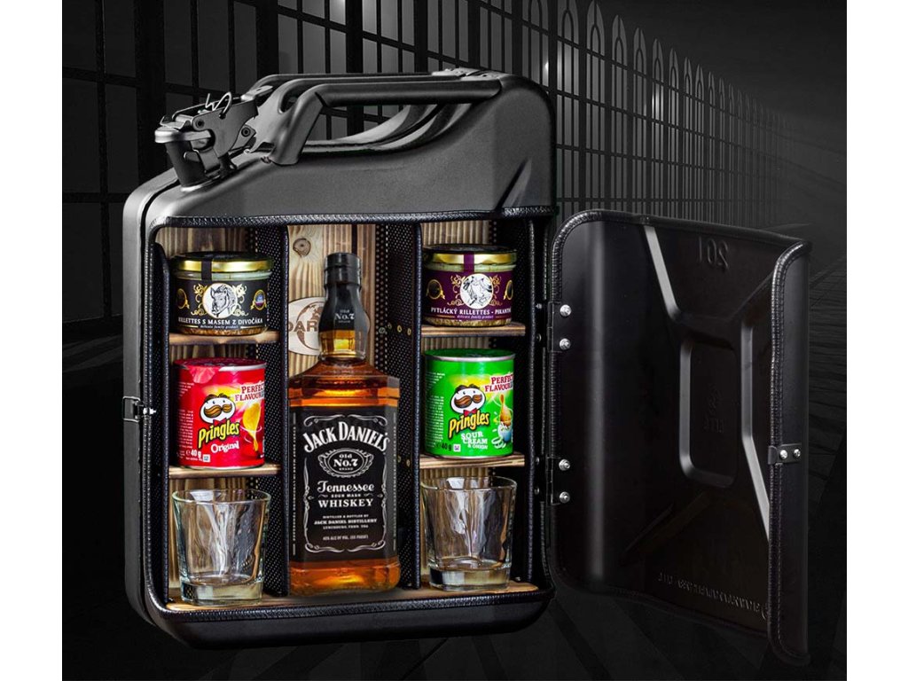 Kovový Bar Kanystr není jen atrapa, ale designový doplněk pro pořádného chlapa vyrobený z opravdového kanystru. Naplníme vám ho základní povinnou výbavou ve které nesmí chybět lahev skvělého Jack Daniels, skleničky na whisky, Pringles dvou příchutí a pro milovníky masa Kančí a Pytlácký rillettes.
